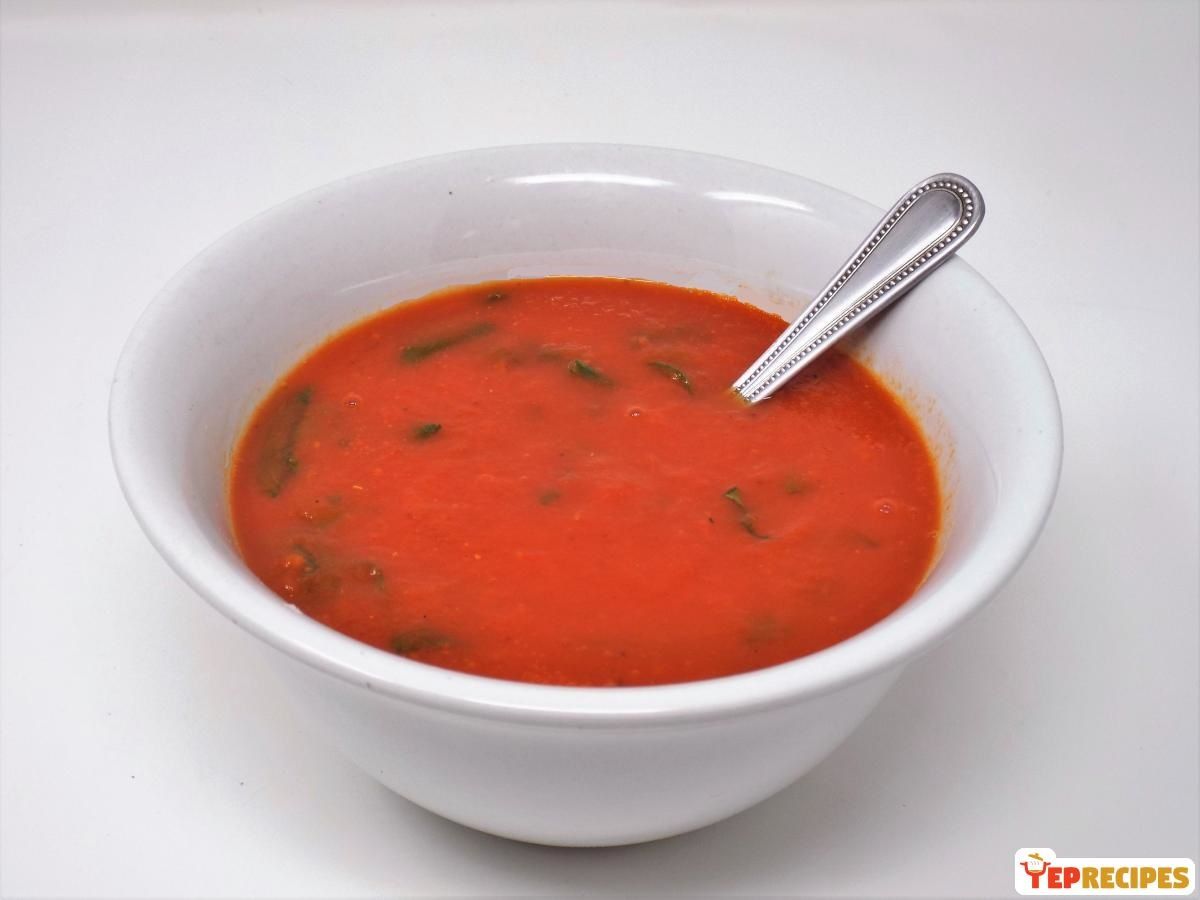 A pureed tomato soup made with onion, celery, carrot, and bell pepper then finished with fresh baby spinach.