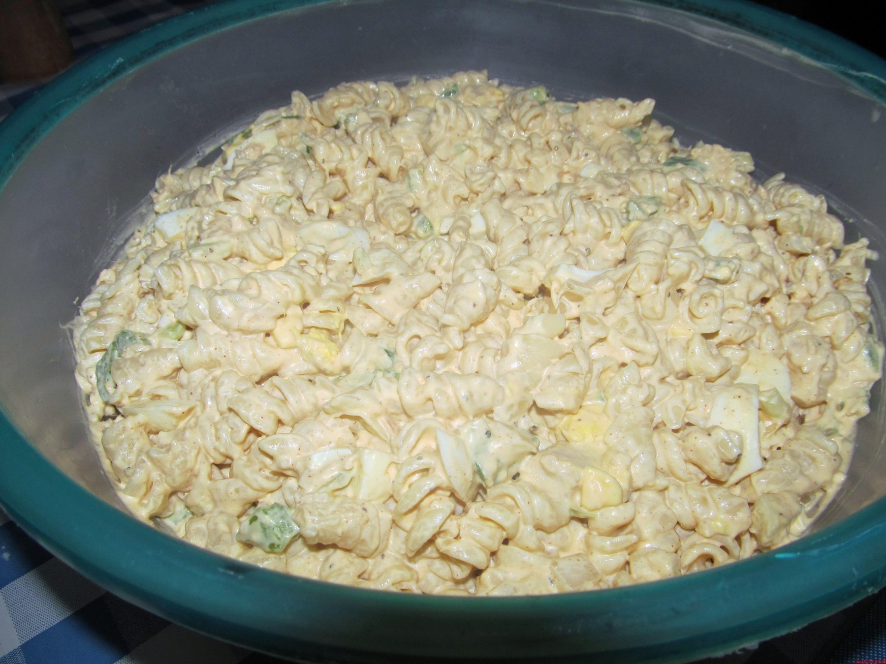 In large bowl mix mayonnaise and spices; add the rest of the ingredients and chill for 2 hours before serving; keep refrigerated.