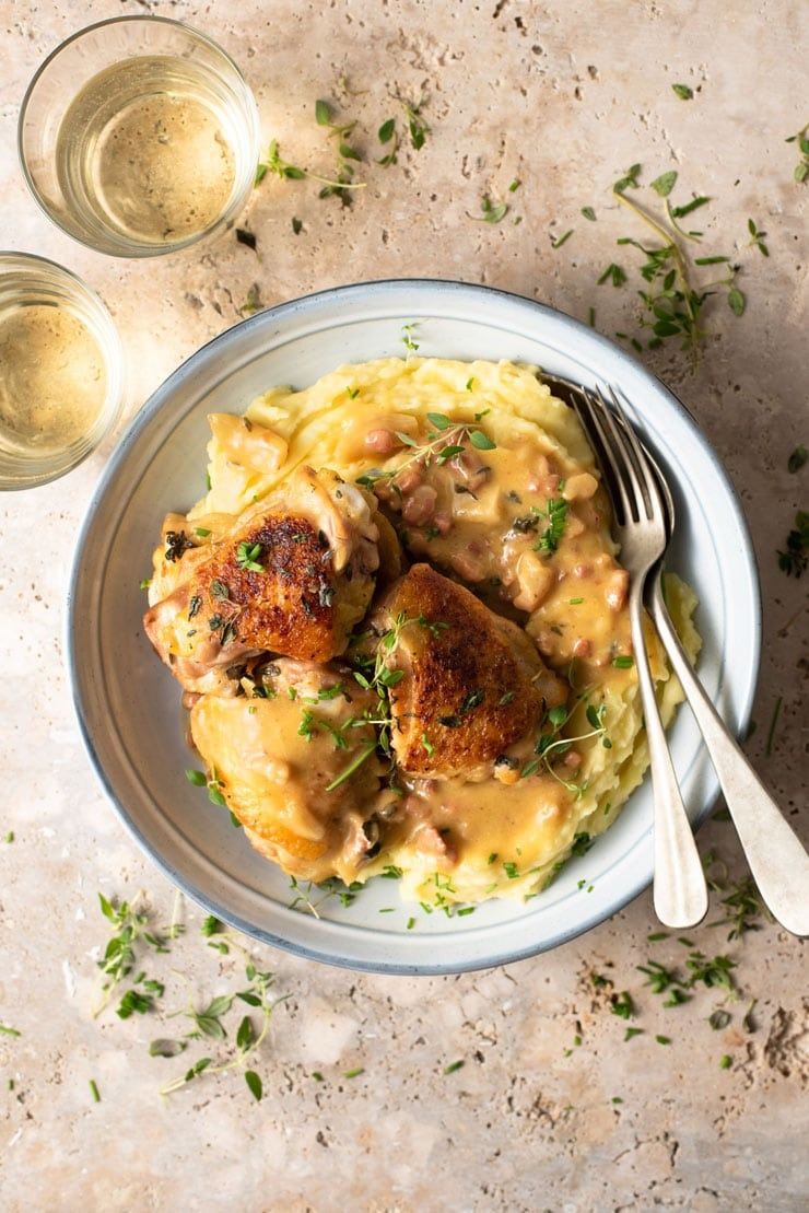 The most incredible Creamy Tuscan Chicken that's actually made without cream! The sauce is rich, smooth and delicious, flavoured with garlic, pancetta and white wine. Serve with comforting mashed potatoes and you're in comfort food heaven!