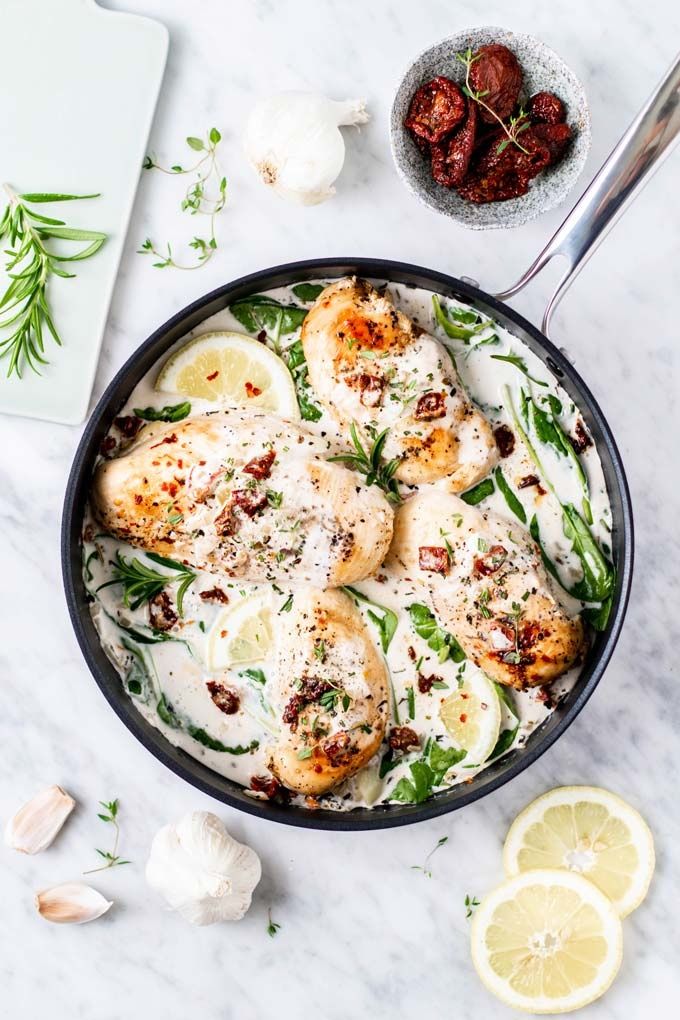 Creamy Tuscan Garlic Chicken, filled with all the flavors of the restaurant classic, but with a luxurious non dairy cream sauce. This Whole30 Tuscan Chicken is easy to make, and perfect for a family meal. Serve this Whole30 chicken dish over cauliflower rice or zoodles for a healthy, protein rich dinner.