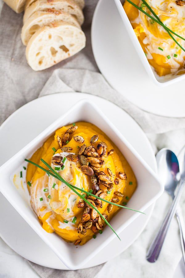 This butternut squash soup recipe is dreamy. It's rich and creamy, vegan, and full of fall flavors! It's topped off with spicy pepitas and fresh chives.