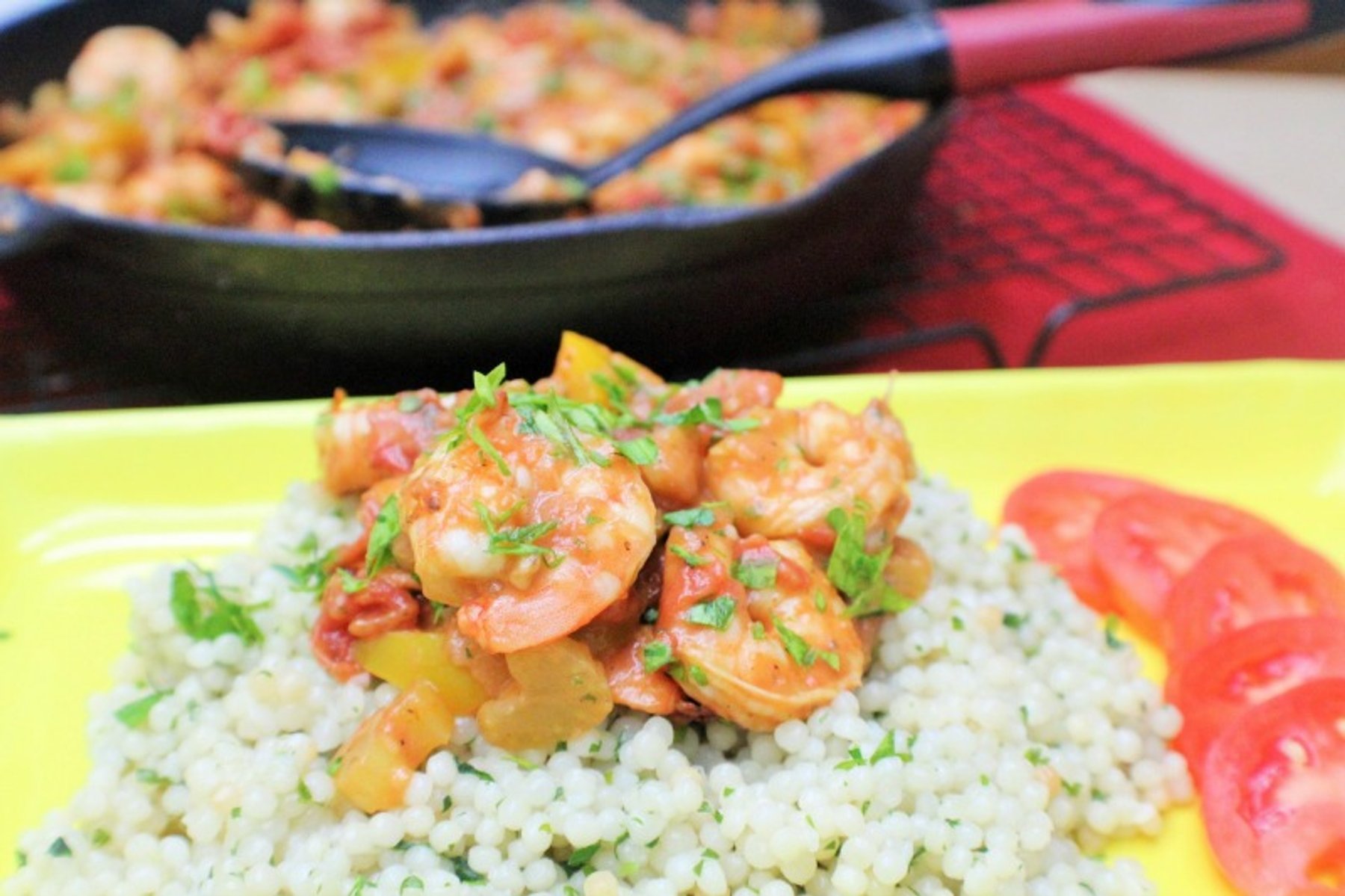 Shrimp cooked up in garlic, tomatoes, celery, bell peppers and onions. Great main dish or can even be used as a salsa. Paired with parsley couscous