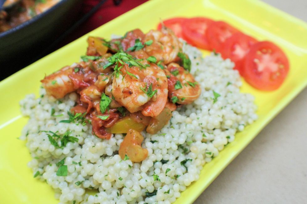 Shrimp cooked up in garlic, tomatoes, celery, bell peppers and onions. Great main dish or can even be used as a salsa. Paired with parsley couscous
