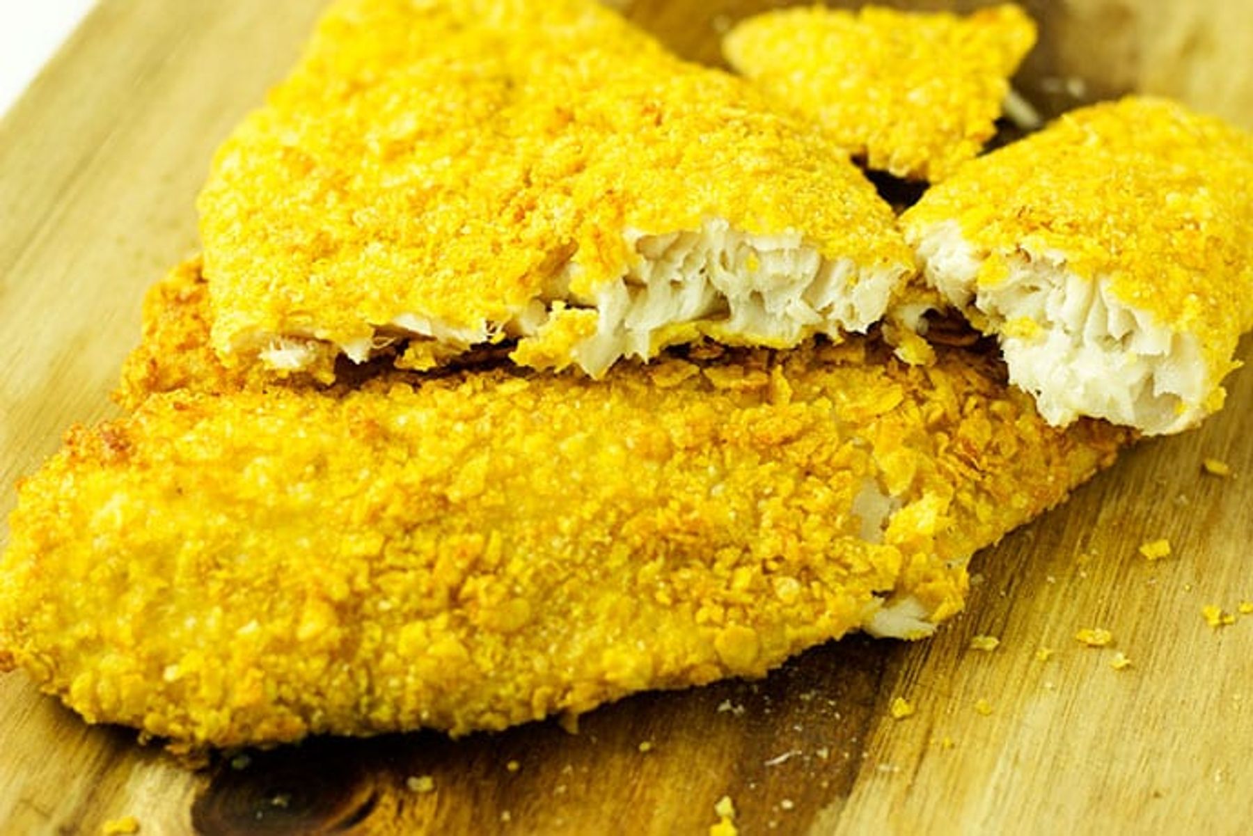 Mix salt, black pepper, cayenne pepper, and flour in a bowl. In a separate bowl, combine egg and water. In a zip lock bag, combine crushed cornflakes and grated parmesan cheese.