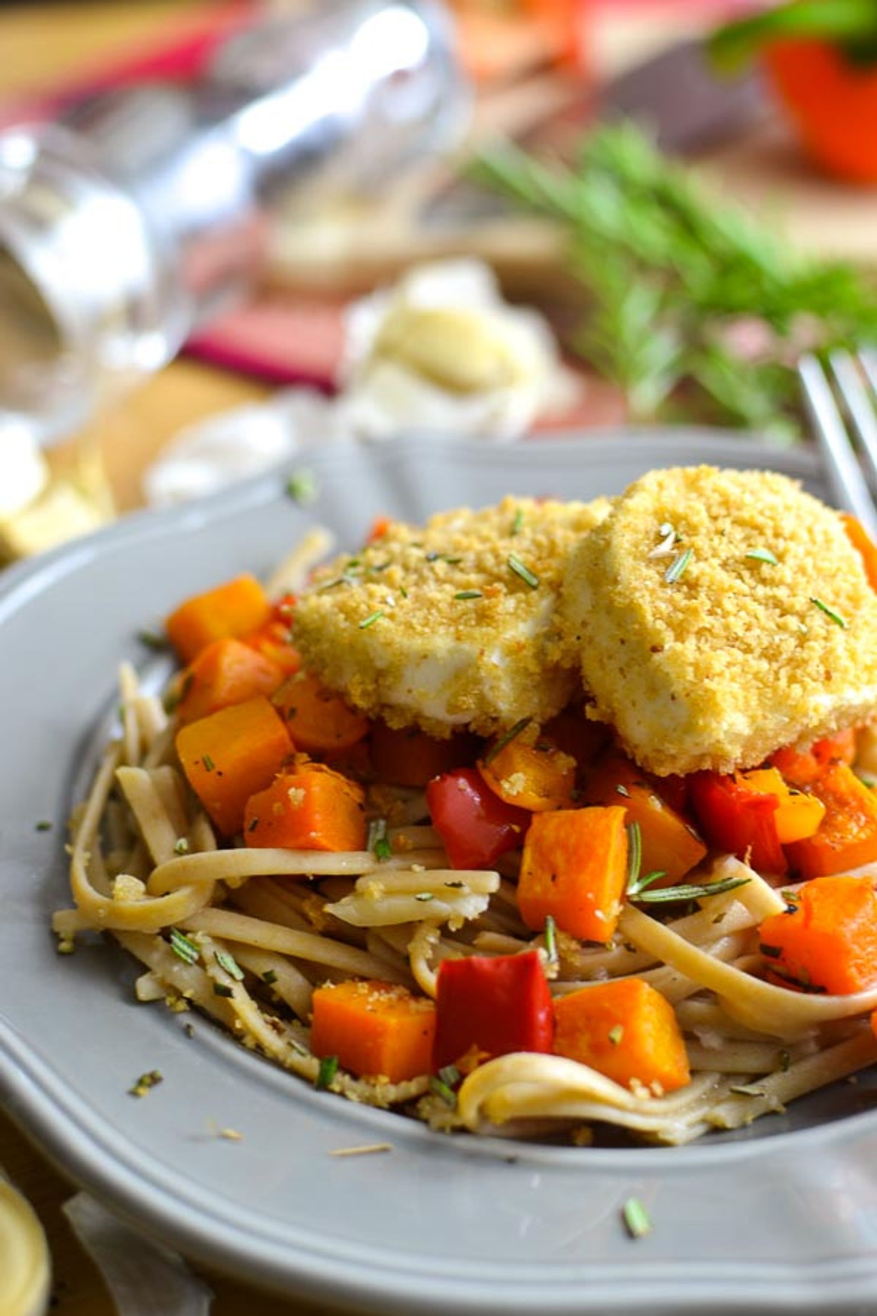 Crispy Baked Goat Cheese Over Roasted Rosemary Squash and Garlicky Fettuccine