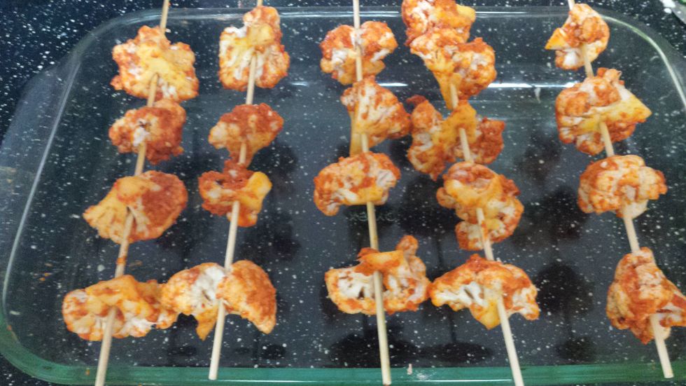 Heat oil in a deep pan ,when oil is hot add the marinated cauliflower florets one by one at a time and fry them untill they turn crisp or weel cooked.(If you wish to bake in oven preheat the oven at 375 F and arrange the marinated cauliflower with skewers and bake for 25 min and reduce the temperature and bake the cauliflower at broil for 5 min.)