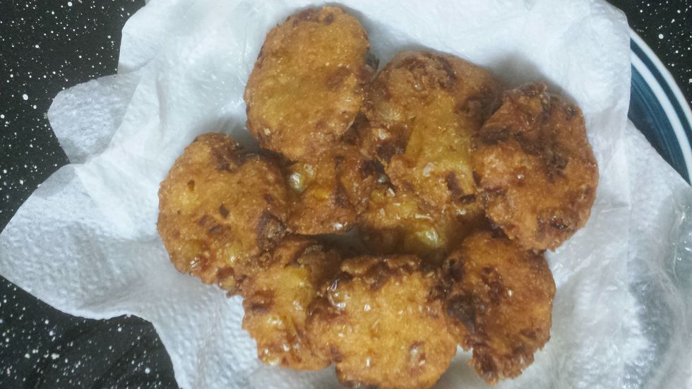 1.In a large mixing bowl ,add corn kernels, corn flour, chopped onion, green chilies, garam masala,salt,cumin seeds, Chana dal,chopped ginger, coriander leaves and combine well.