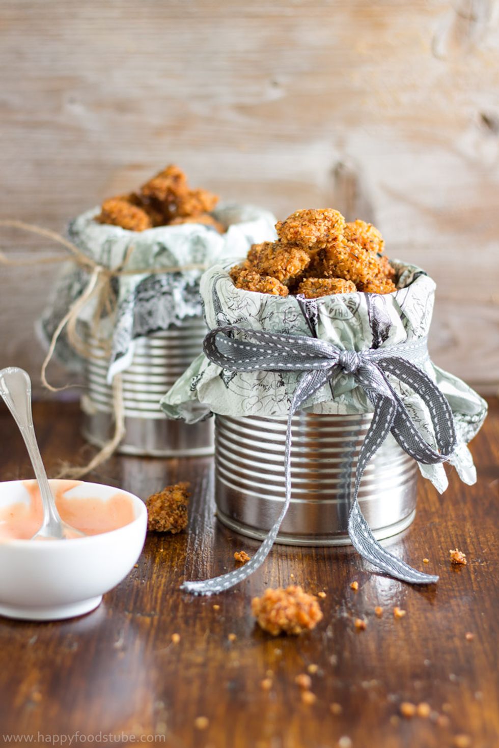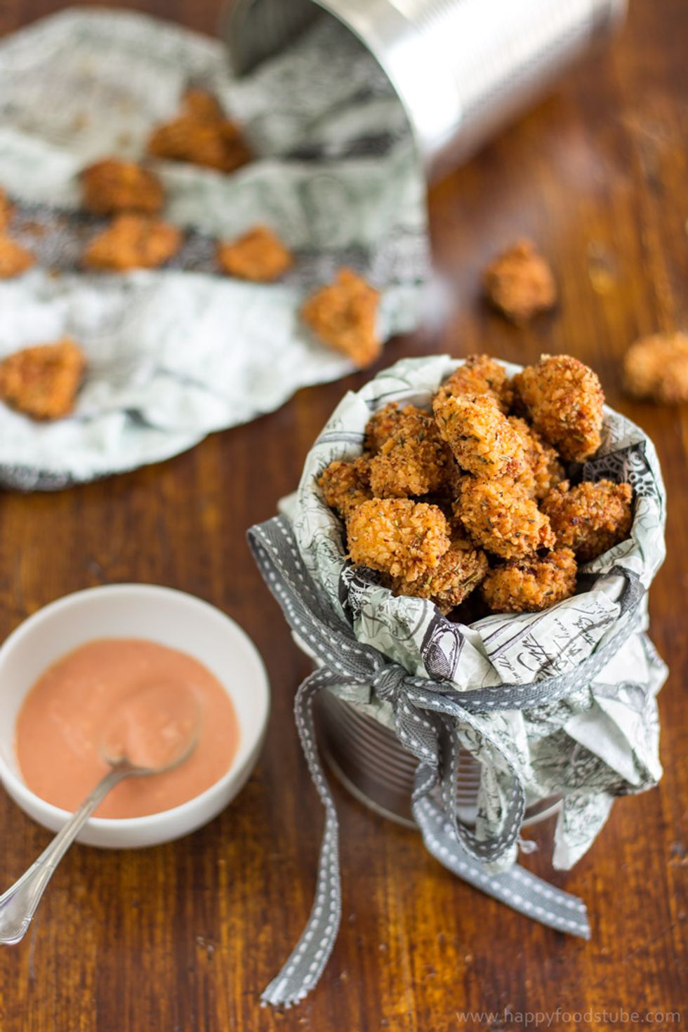 Crispy homemade popcorn chicken. A very easy recipe for this popular and delicious snack. Chicken pieces coated in breadcrumbs & served with yummy dip.