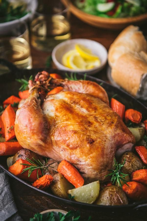 An easy dinner recipe that every home cook should have! This crispy roast chicken with vegetables and potatoes looks impressive, tastes amazing, and only requires 15 minutes of prep. Butter, lemon, garlic, celery, and herbs flavor the juicy meat and the beautiful golden brown exterior. Serve your oven roasted chicken with a loaf of crusty bread, a basket of buttermilk biscuits, or a pan of honey cornbread!