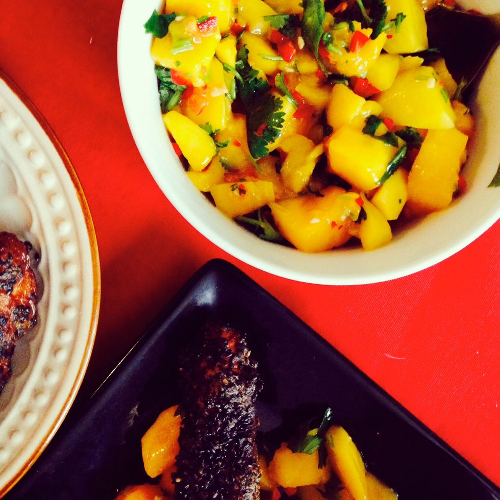 Crispy salmon strips covered with black sesame seeds and served on a bed of mango ginger salsa.
