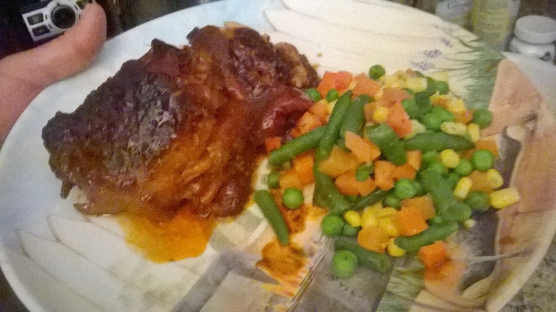 Delicious barbeque chicken thighs with mixed vegetables.