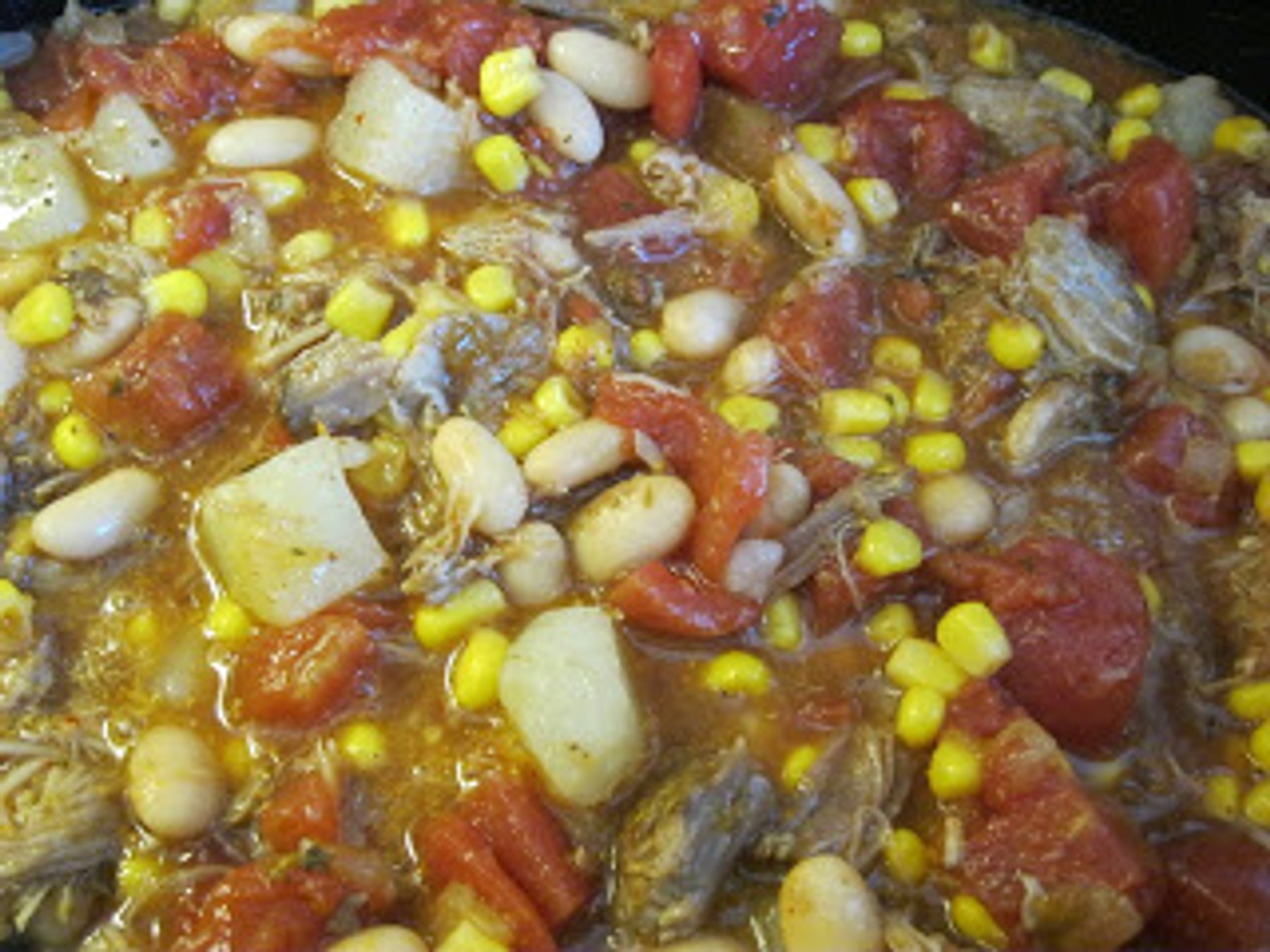 Hearty and satisfying stew with pulled pork, potatoes, corn, beans, and 2 kinds of bbq sauce. Absolutely delightful. You will make this again and again!