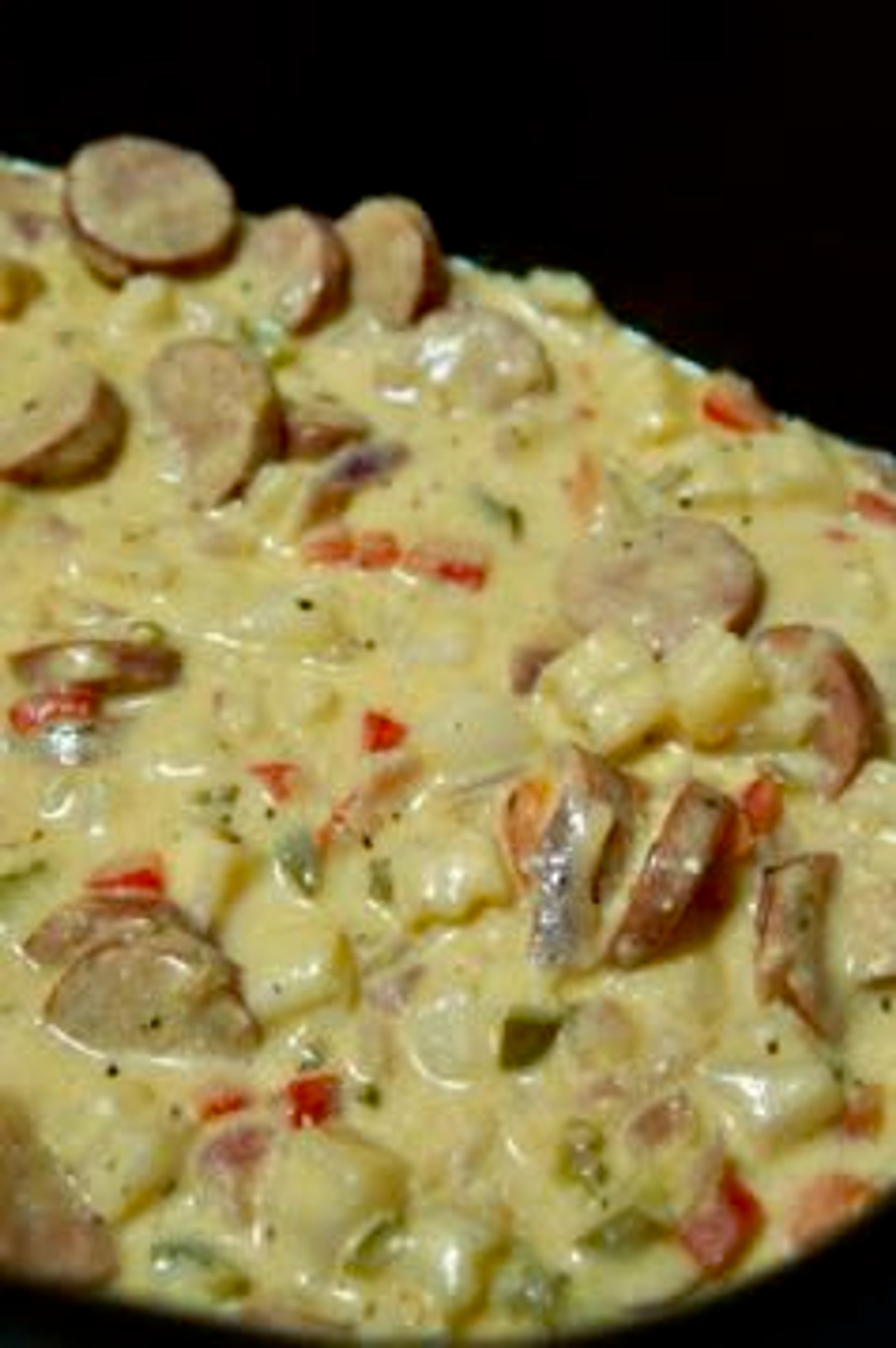 Place the frozen potatoes, diced bell peppers, diced onion, sliced sausage, shredded cheese, sour cream, oregano and basil. Stir in the cream of chicken soup and season with black pepper.