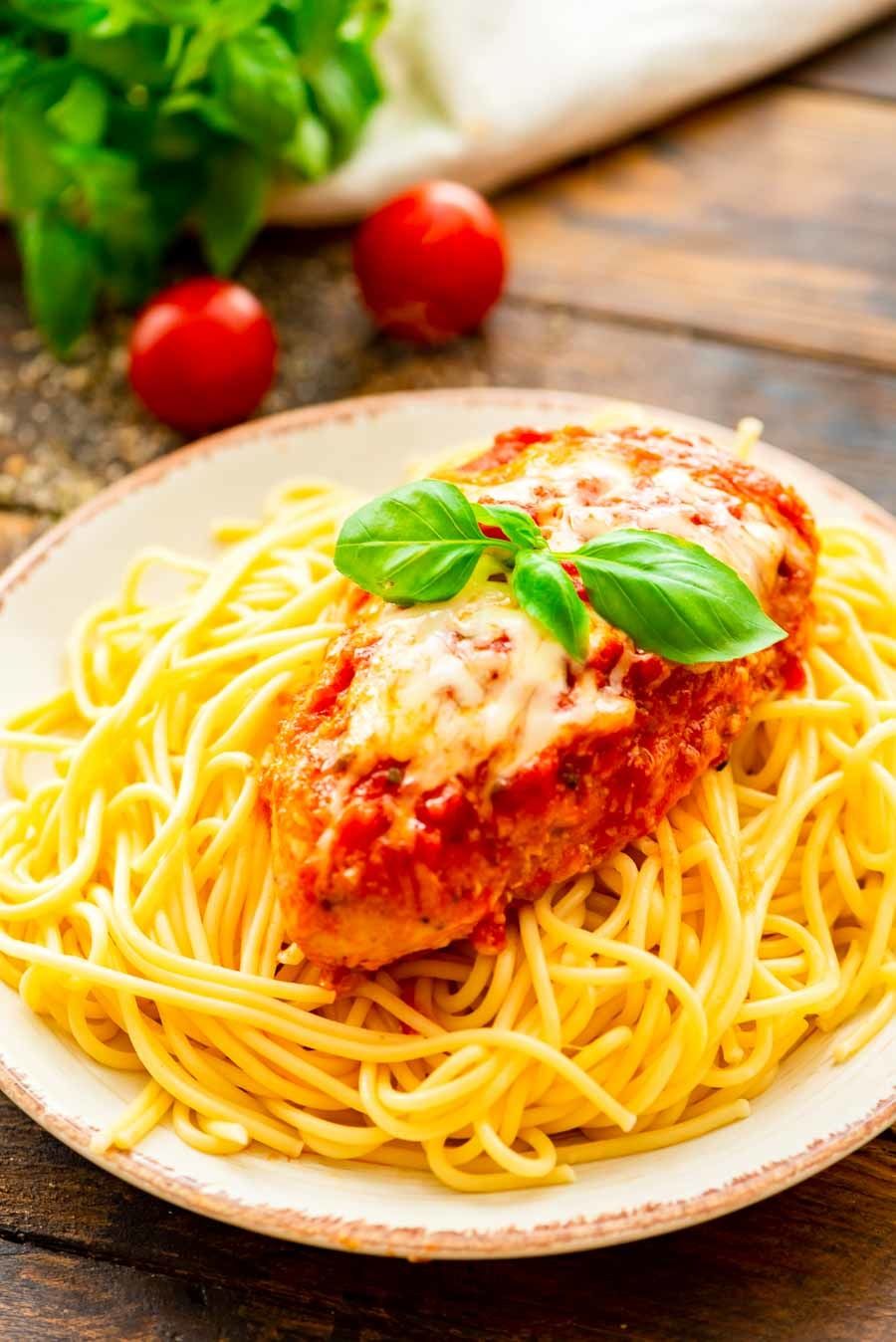Crock Pot Chicken Parmesan is a quick and easy take on traditional Chicken Parmesan! Tender, juicy chicken breasts that are seasoned with Italian Breadcrumbs, Parmesan cheese and seasonings. Then they are cooked in your slow cooker with Mozzarella cheese and spaghetti sauce. Serve these over spaghetti noodles for a quick and easy dinner recipe!