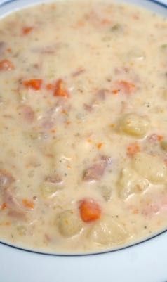 - In a crock pot, add the potatoes, onions, carrots, celery, ham, black pepper and chicken broth.
