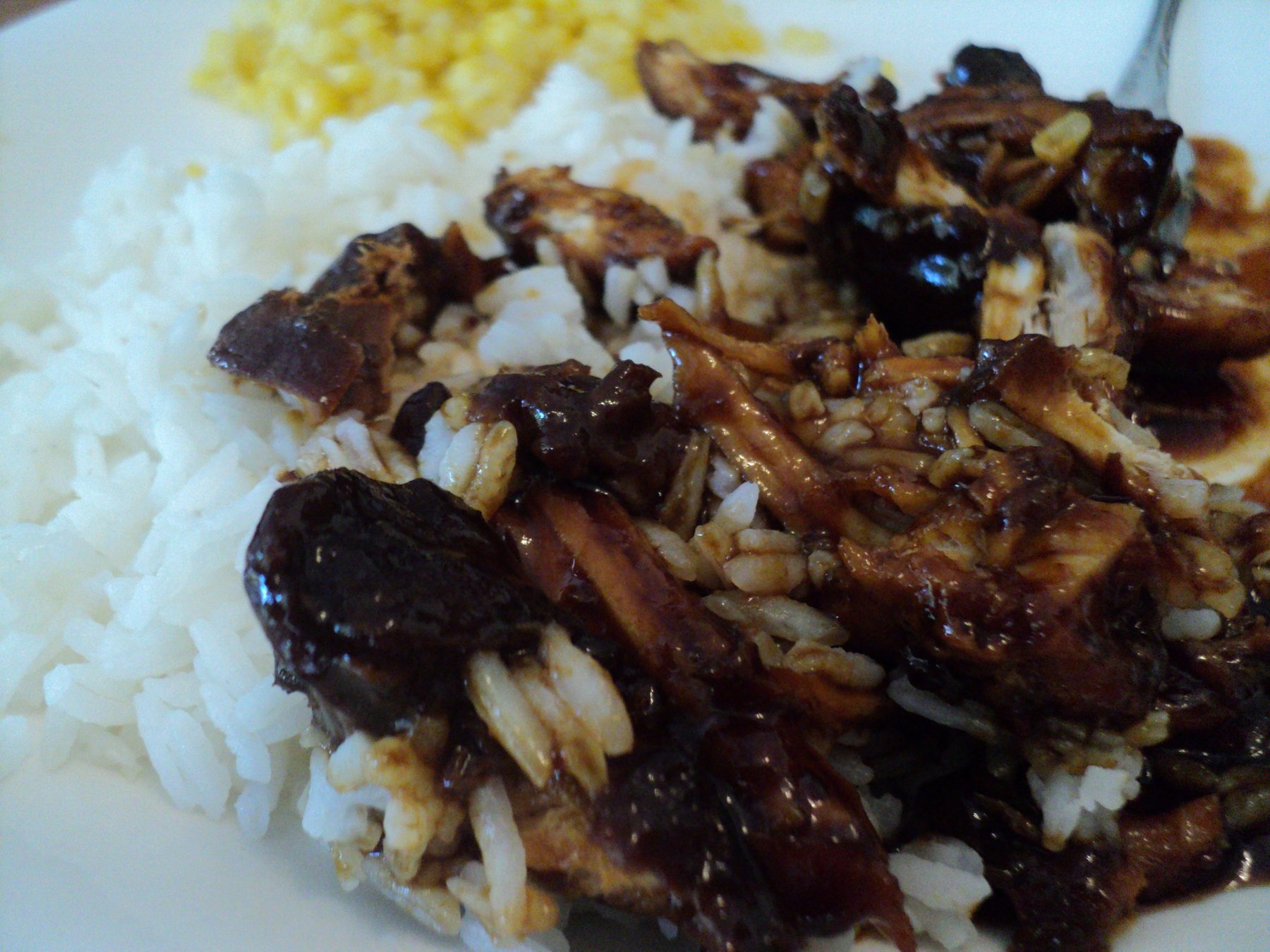 Place chicken in bottom of slow cooker. Mix all remaining ingredients together and pour over the chicken. Cook on high for 4 hrs. When ready, shred and serve over rice. Enjoy your homemade take out.