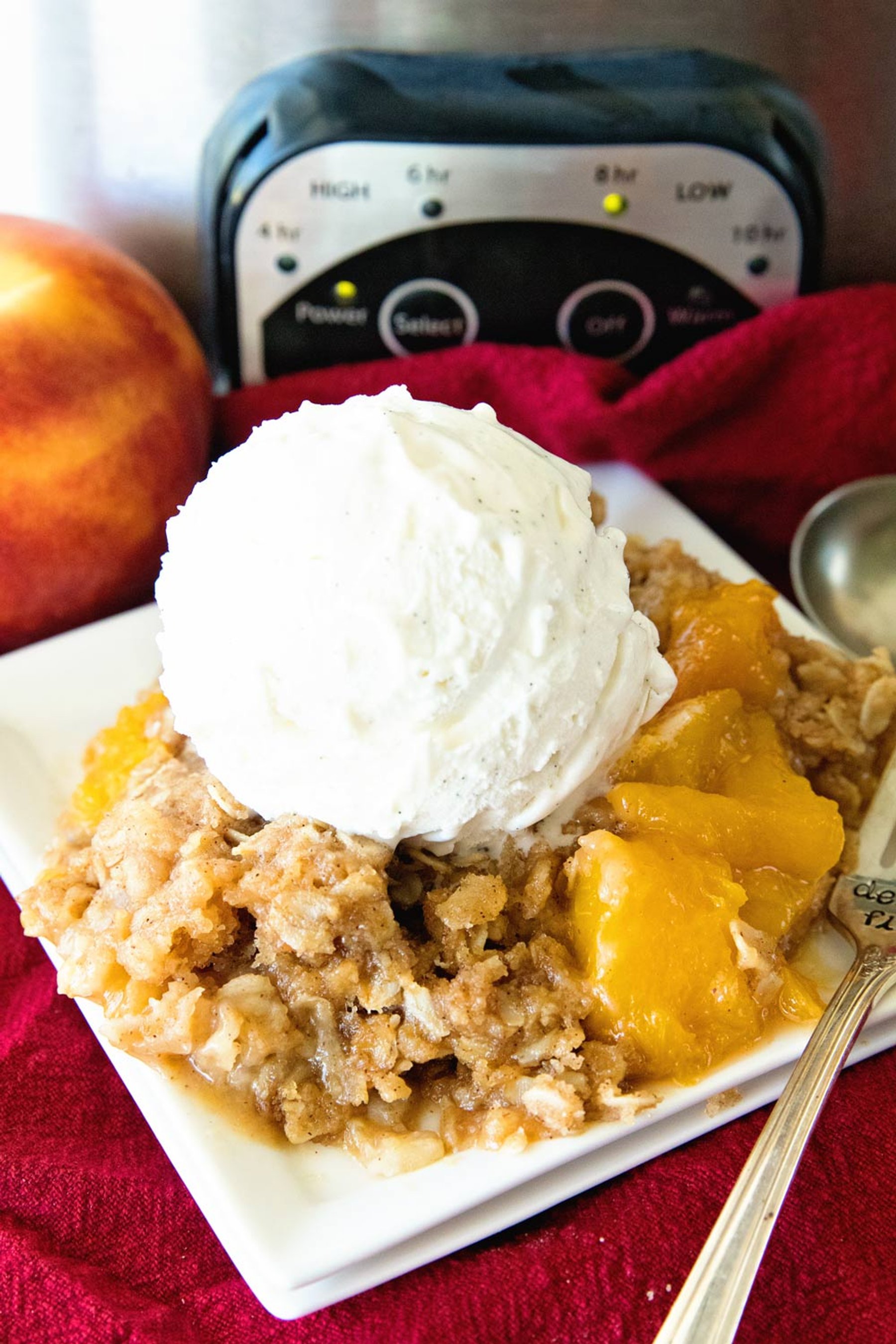 Crock Pot Peach Cobbler ~ Fresh Peaches, Crumble Oat Topping, The Perfect Quick and Easy Summer Dessert! Top it with a Scoop of Ice Cream!