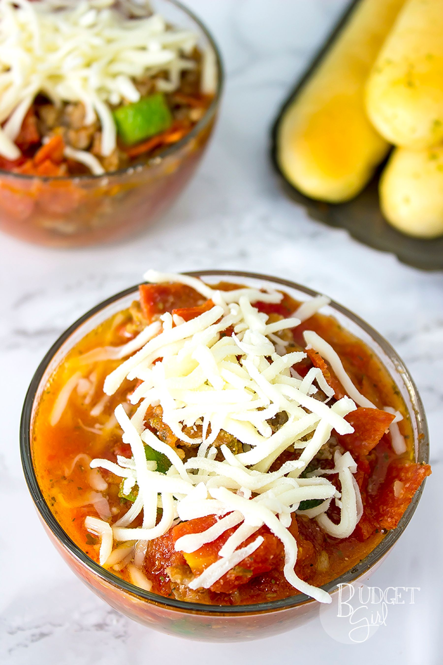 Crock pot pizza soup is an easy, delicious soup your whole family will love. It can be customized to fit the needs of the pickiest eaters. Also works as a freezer meal!