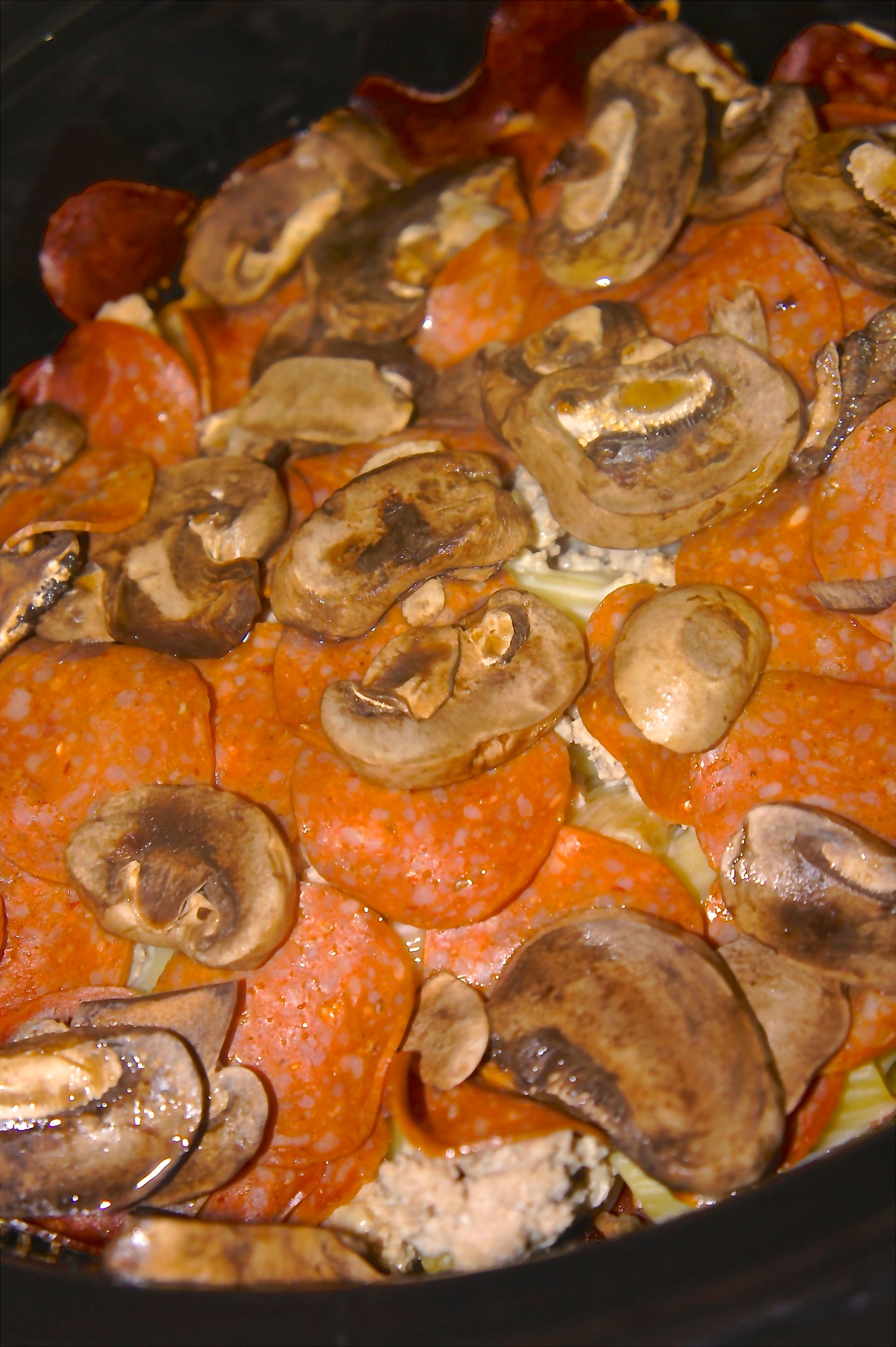 Spray a crock pot with cooking spray. Layer half of the spaghetti sauce, half of the pasta, half of the turkey, half of the mozzarella, half of the pepperoni and half of the mushrooms. Repeat layers with...