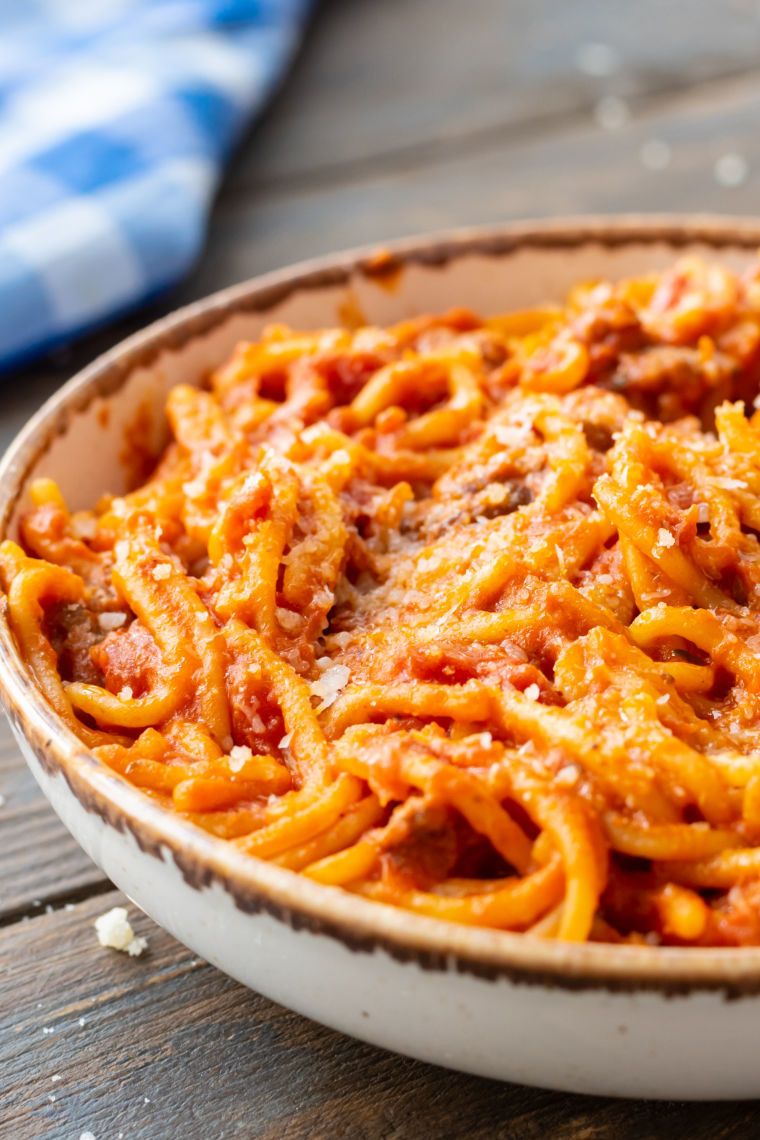 Your favorite family dinner can now be made easily in your Crock Pot! This Crock Pot Spaghetti is so easy with tons of flavor. Tender spaghetti noodles, spicy Italian sausage in a creamy spaghetti sauce made with cream cheese in your slow cooker! It's our favorite way to enjoy spaghetti. Plus, it's quick and easy for busy nights.