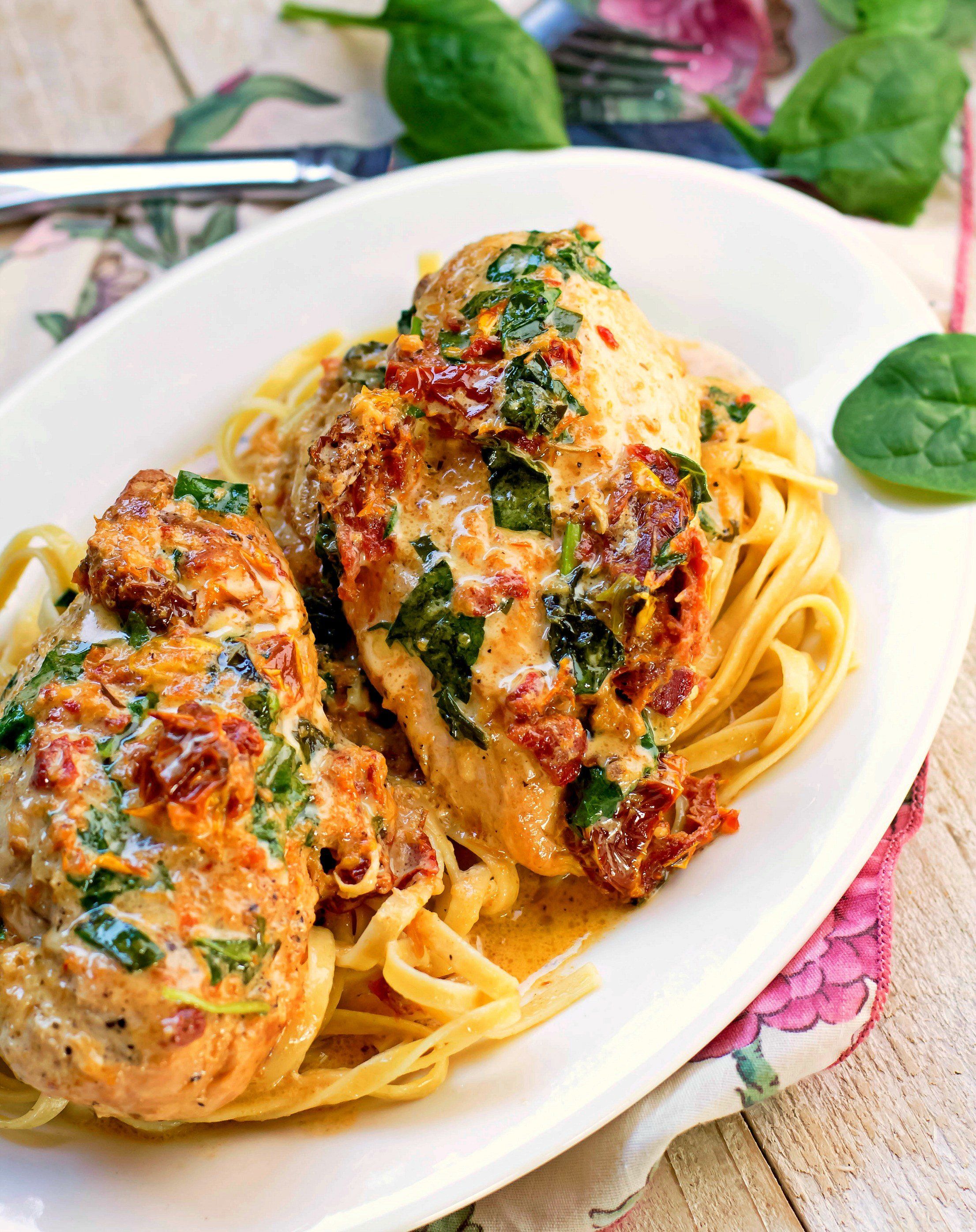 Crock Pot Tuscan Chicken is an amazing dinner that once you make it, you will want it again (and again!). I mean seriously…there is no way that you can go wrong when you decide to go deep into your shelves to pull out your slow cooker for Crock Pot Tuscan Chicken. Then there is the fresh spinach that is stirred in at the very end of making the dish. It is cooked until it is just wilted enough to retain its glorious bright green color that is beautiful. Between the sight of the deep red dried tomatoes and the creamy homemade alfredo sauce…it is as pleasing to the eye as it is to the palate.