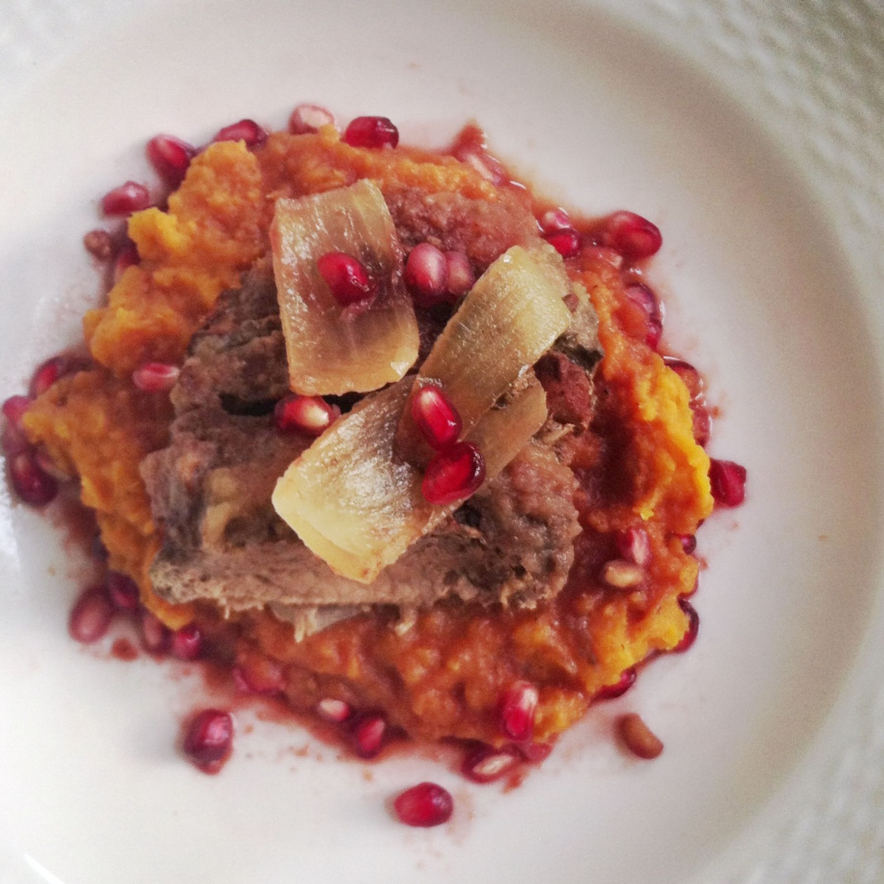 Crockpot Apple Cinnamon Pork with Sweet Potato Puree and Pomegranate Reduction (whole30)