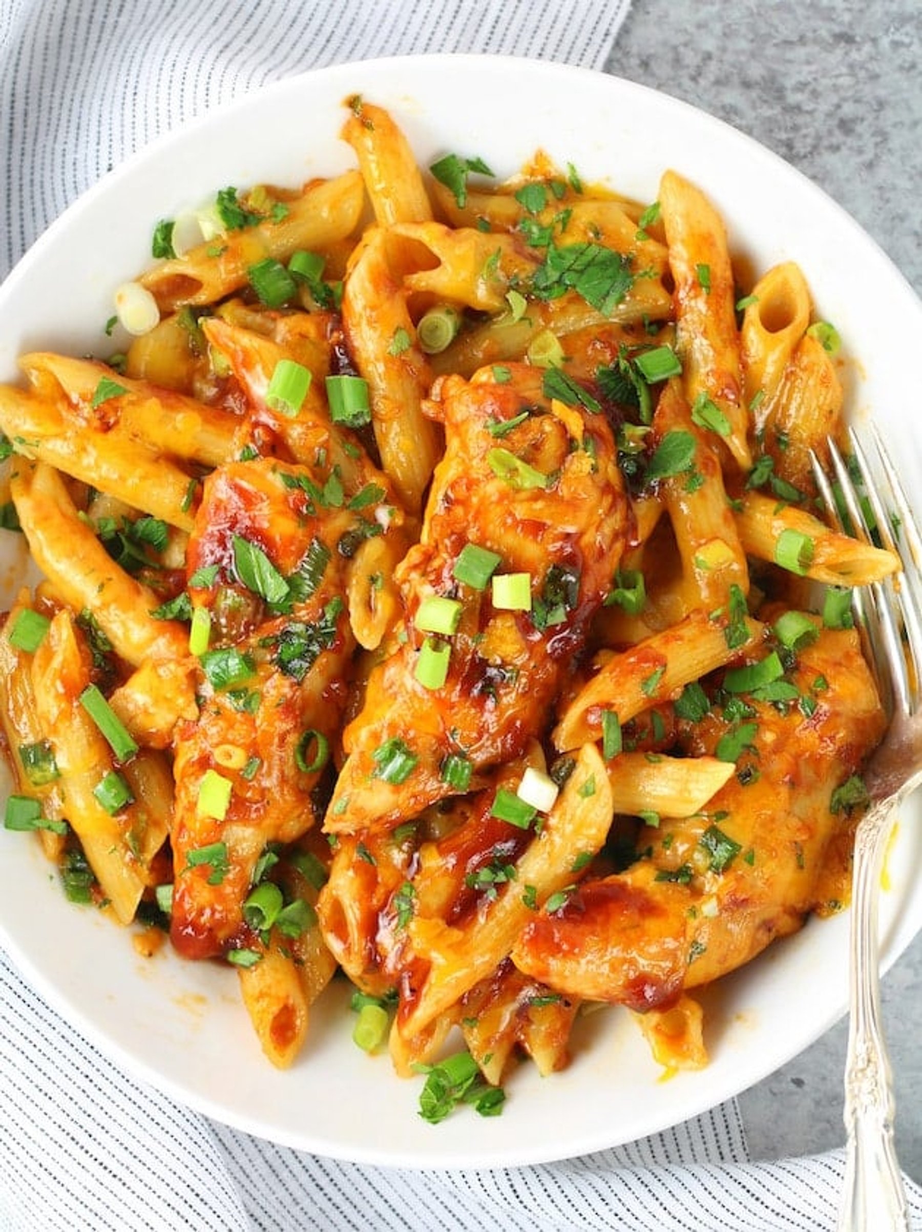 Slow cooker BBQ chicken pasta with savory and sweet sauce, shredded cheddar cheese, and penne, all topped off with chopped green onions. An absolutely mouth-watering pasta creation!