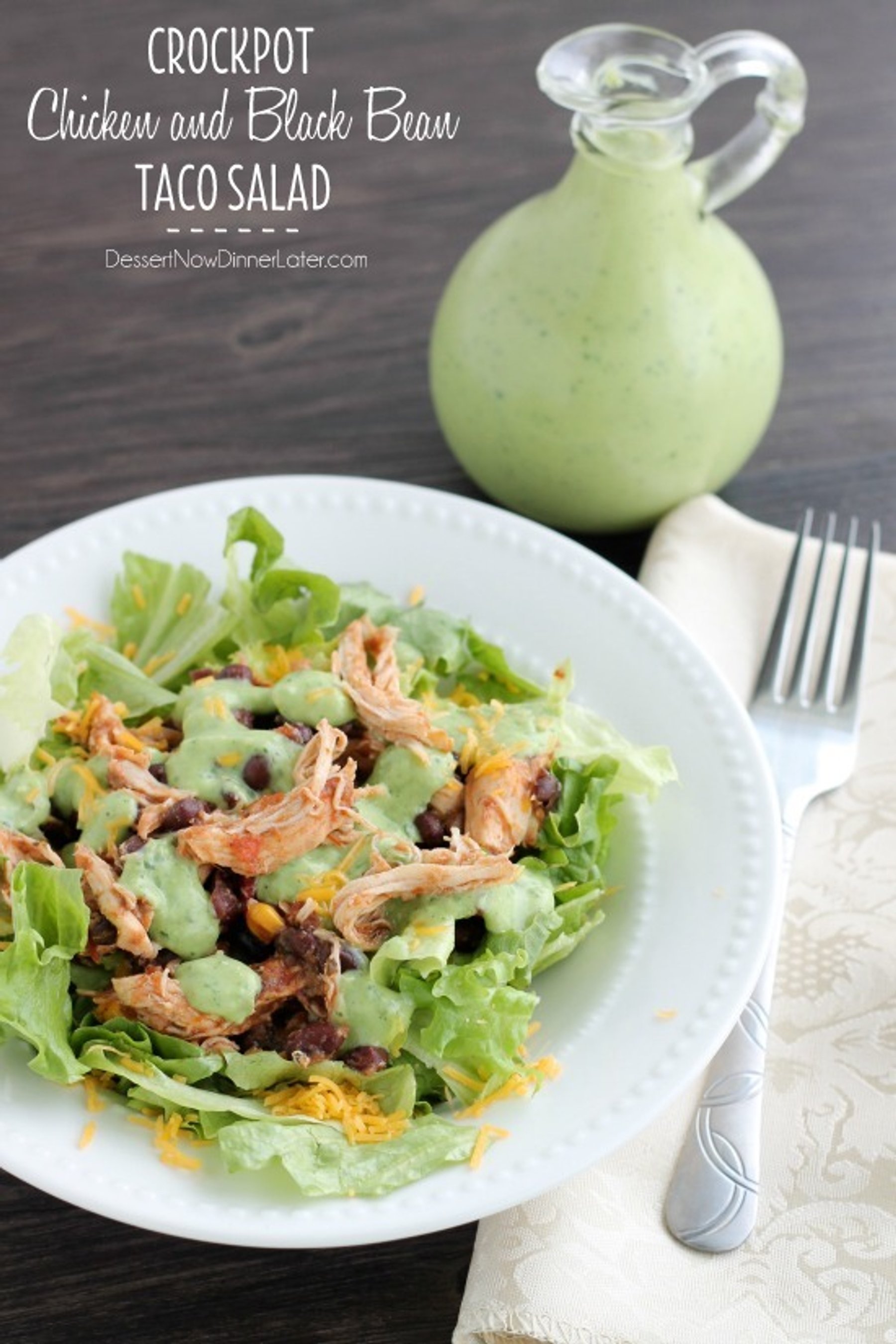 Crockpot Chicken and Black Bean Taco Salad is low in fat and calories, yet is full of flavor and will fill you up.