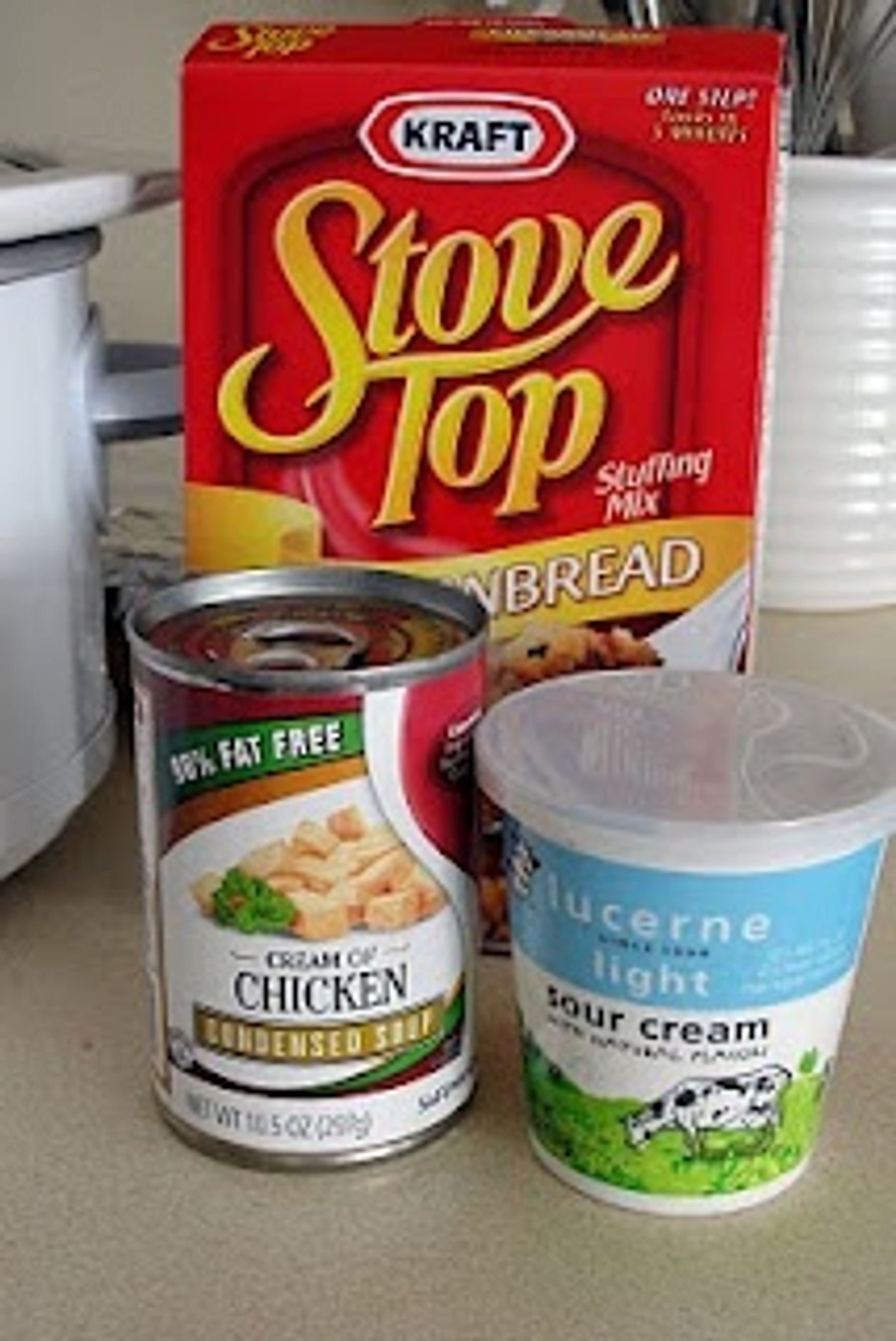 Mix sour cream and chicken soup in a small bowl and pour over stuffing. Do not mix