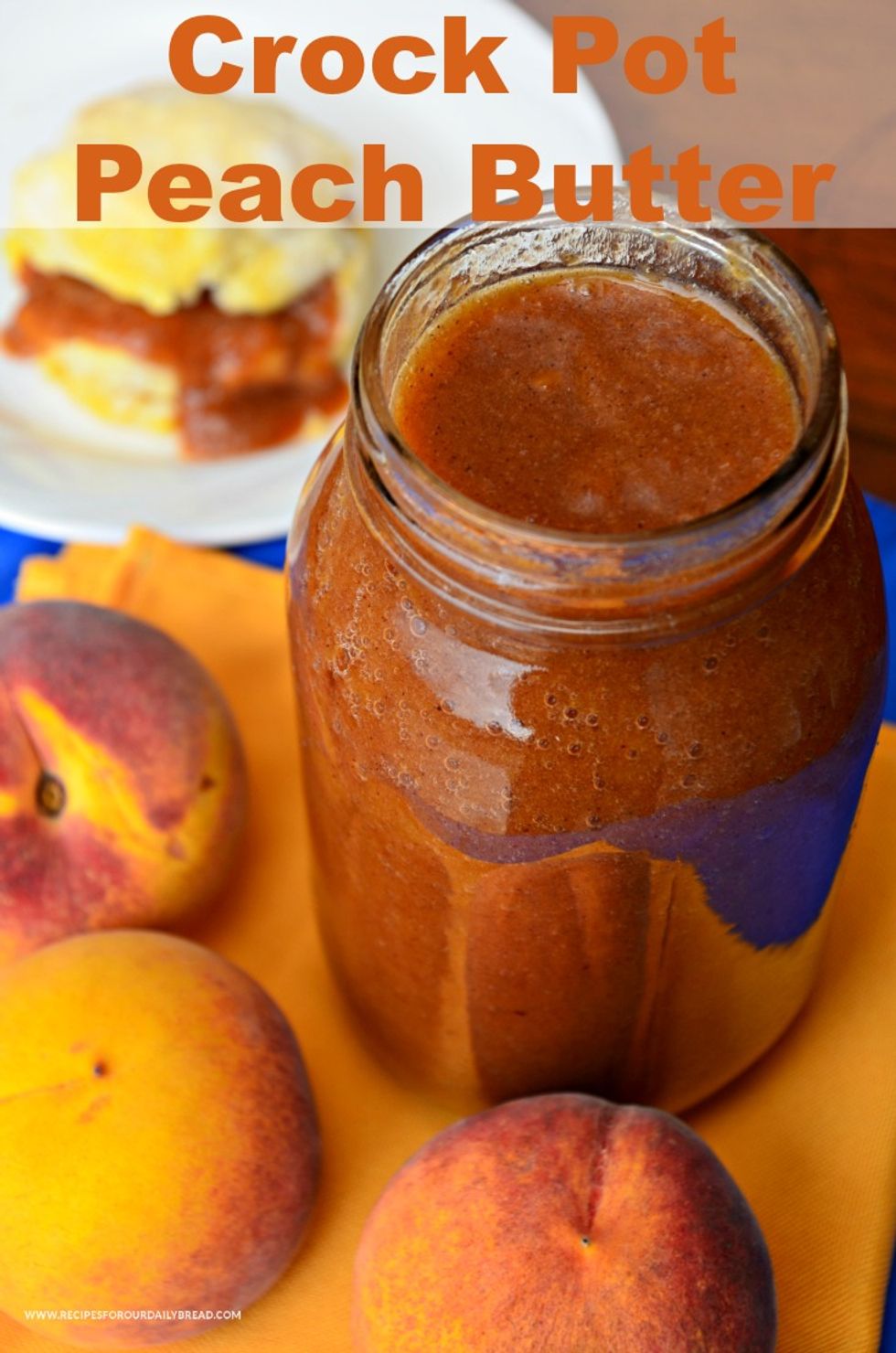 Crockpot Peach Butter is a great way to use your fresh peaches. It is amazing with peach fritters, bagels, biscuits, toast, ice cream and more. Crockpot Peach Butter includes simple ingredients including peaches, sugar, and some spices.