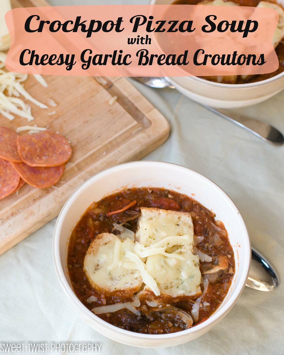 Crockpot Pizza Soup with Cheesy Garlic Bread Croutons