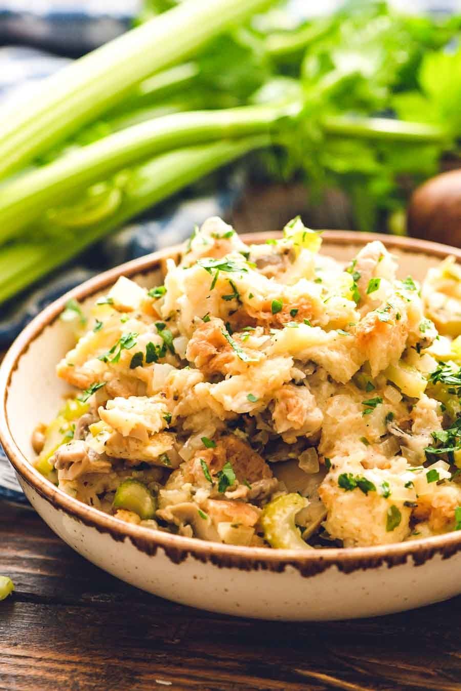 This easy Crockpot Stuffing is perfect for holidays when oven space is short! It's slow cooked while you are preparing for the holidays so you don't have to worry about it. This dressing has an amazing flavor because of the herbs and seasonings. Plus, it's so easy and delicious. Throw this stuffing recipe in your slow cooker during the holidays for a stress-free dinner.