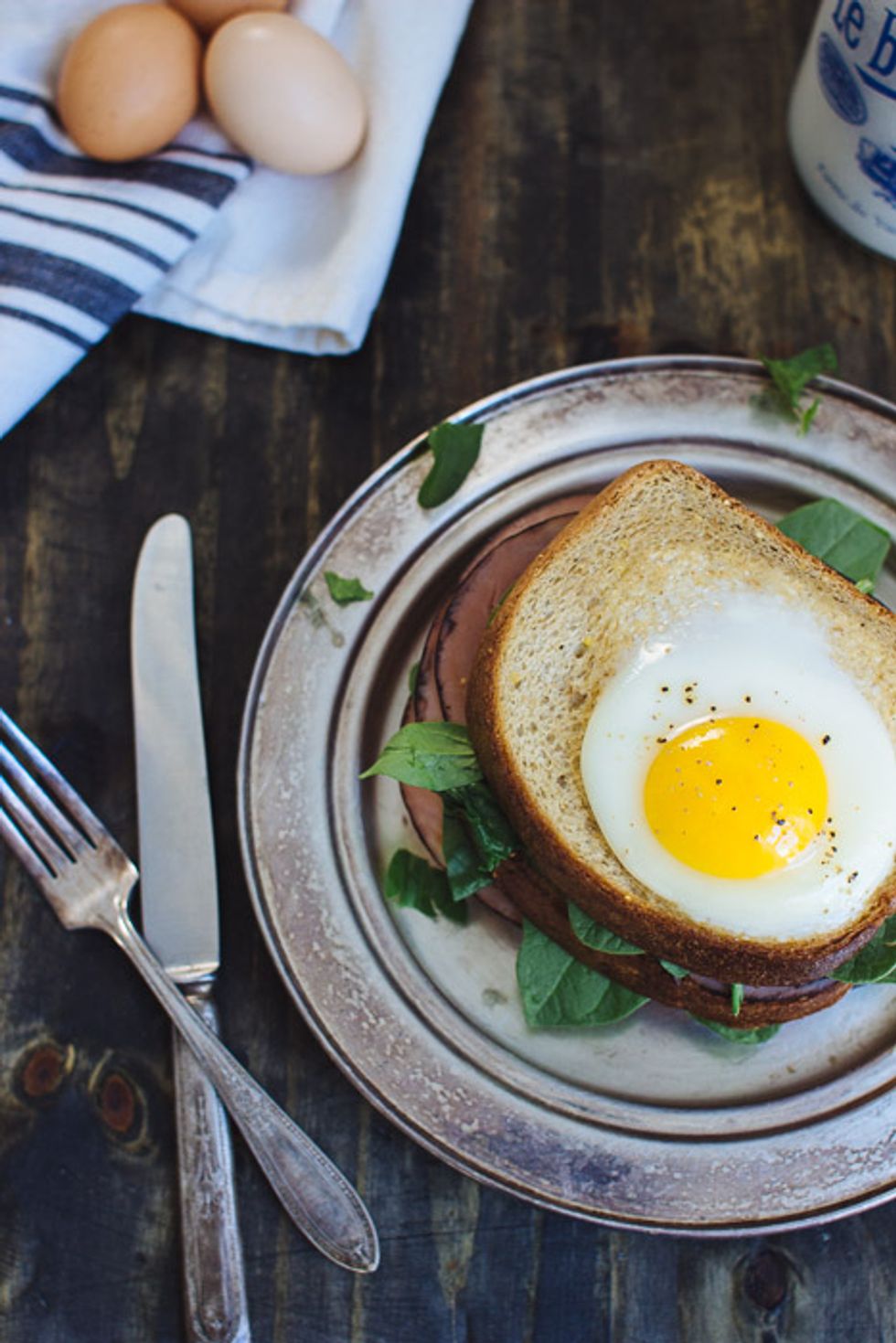The perfect brunch! Hearty bread filled with ham and spinach and topped with a fried egg and béchamel sauce!
