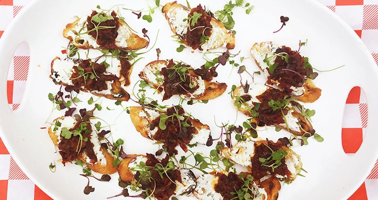 This Grilled Crostini with Goat Cheese and Fullblood Wagyu Beef Bacon and Sun-dried Tomato Jam recipe makes a delicious sweet, salty, and savory appetizer.