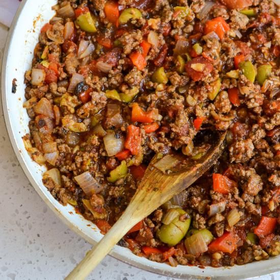A quick and easy traditional Cuban Picadillo recipe with ground beef, onion, tomatoes, green olives, and raisins in a tomato sauce seasoned with cumin and oregano.