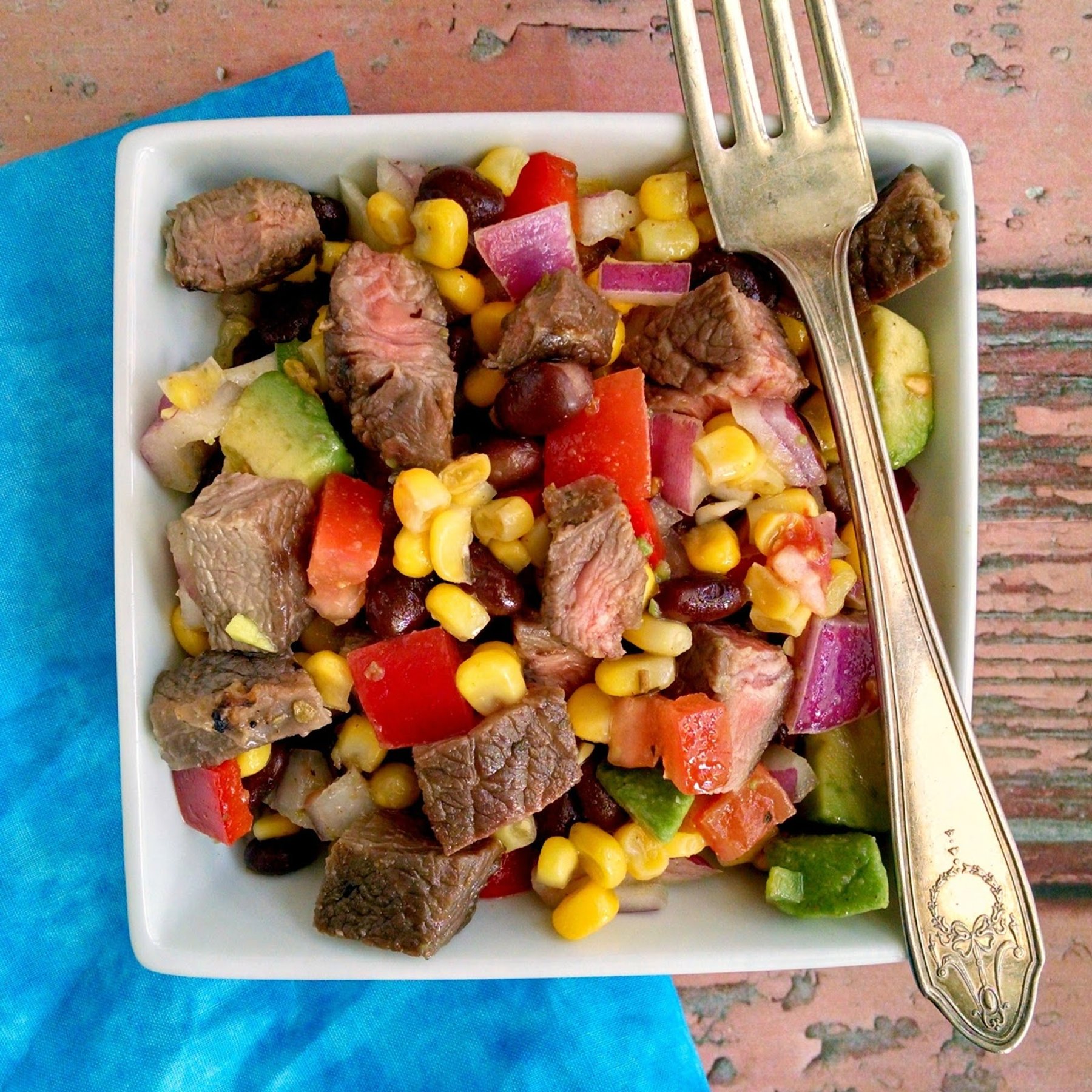 Chuck tender steaks are infused with a Cuban style marinade and grilled, sliced, and placed on top of a Cuban inspired corn and black bean salad. This Cuban Style Steak and Corn Salad sounds expensive, but really isn't.