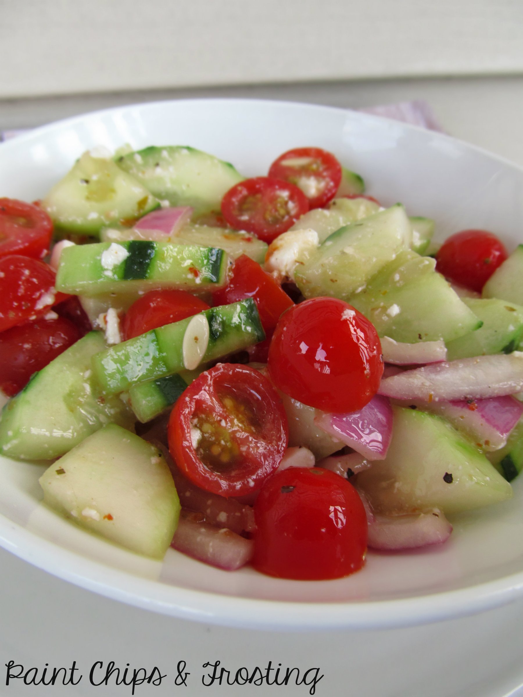 Garden fresh cucumbers, tomatoes, and onions pair perfectly with crumbled feta and a tangy vinaigrette in this light and summery side! It comes together in just minutes and is the perfect addition to a barbecue!