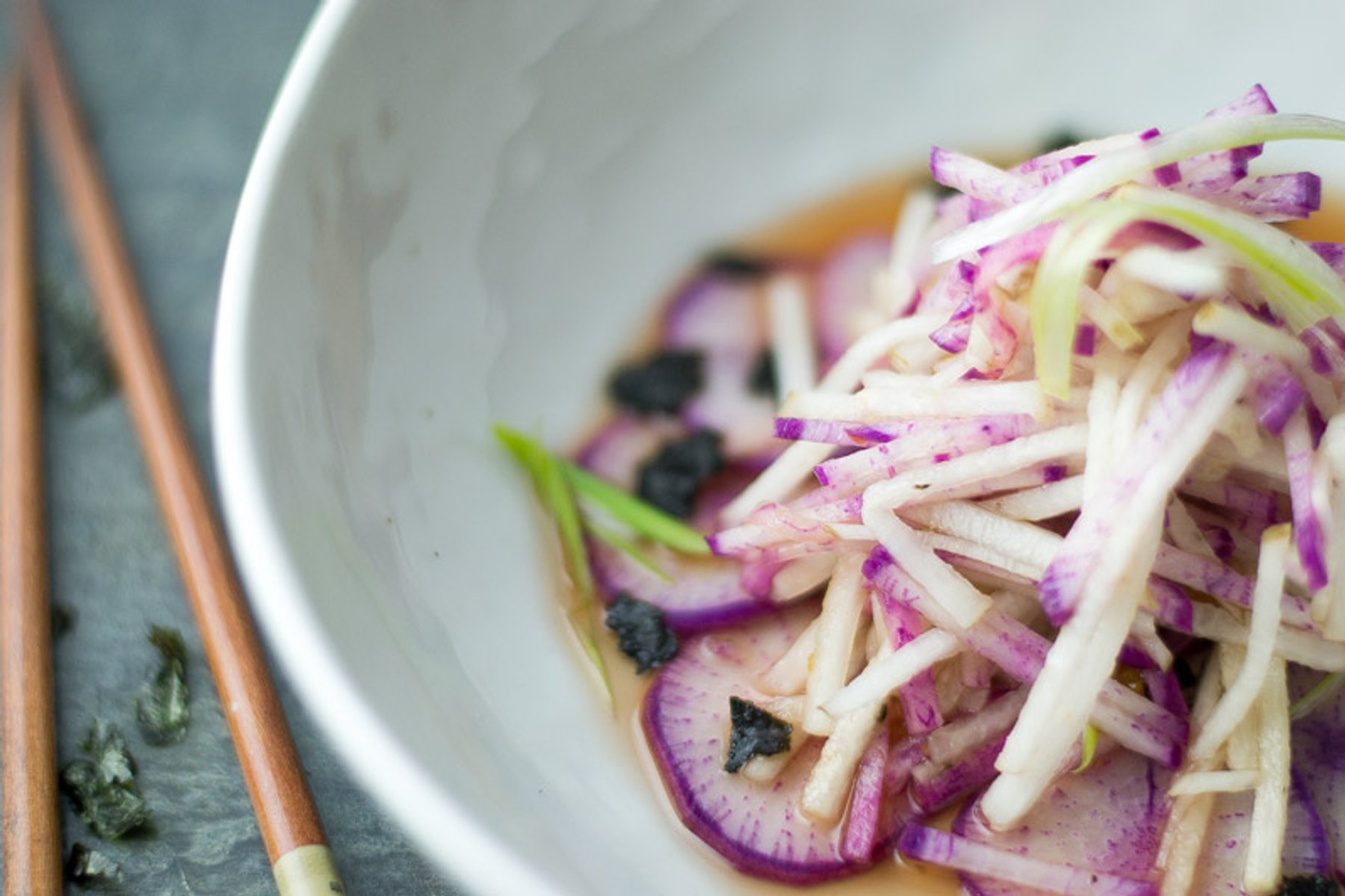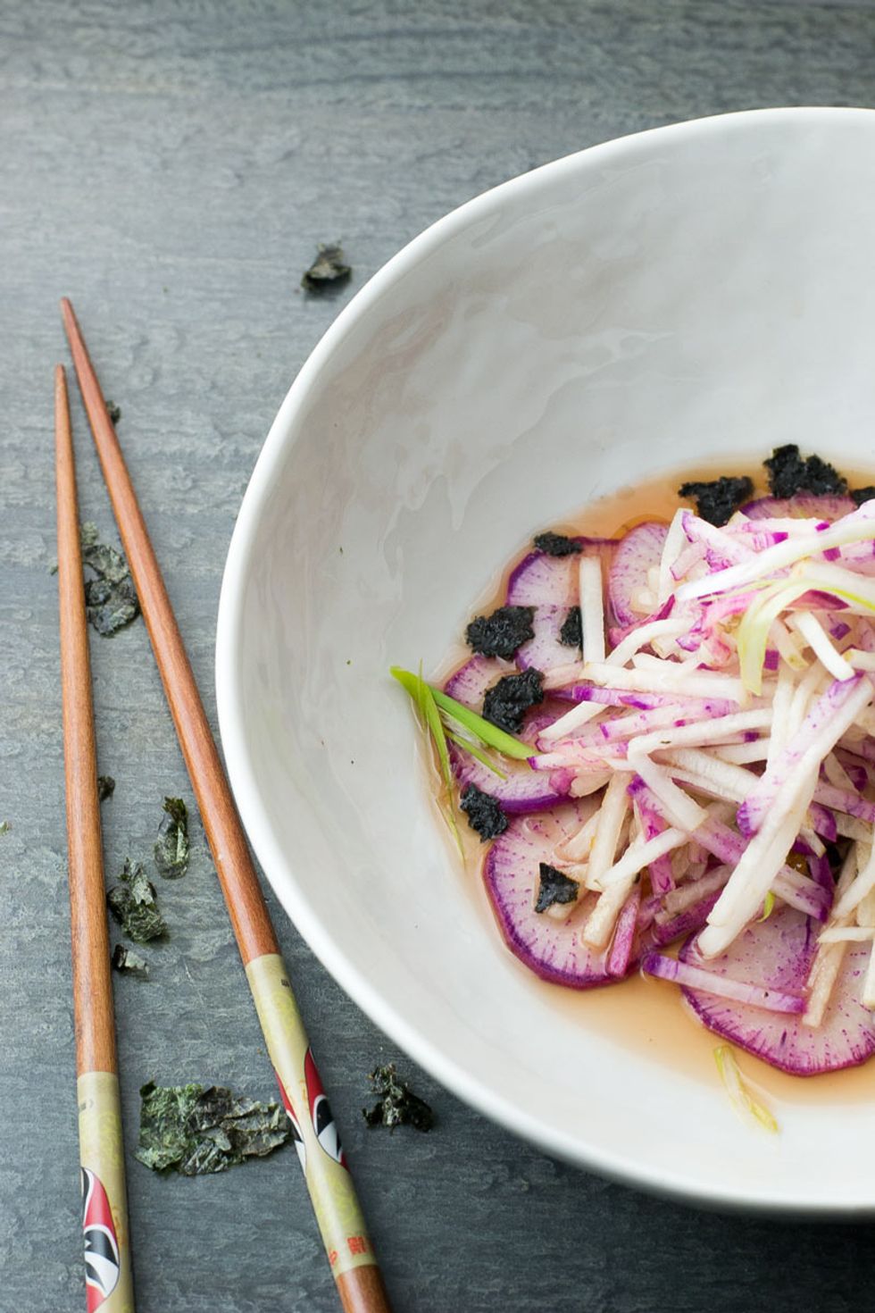 A light, delicate salad made with just purple daikons, nori and a lovely, fragrant plum sauce. It's a perfect salad for a summer Sunday brunch.