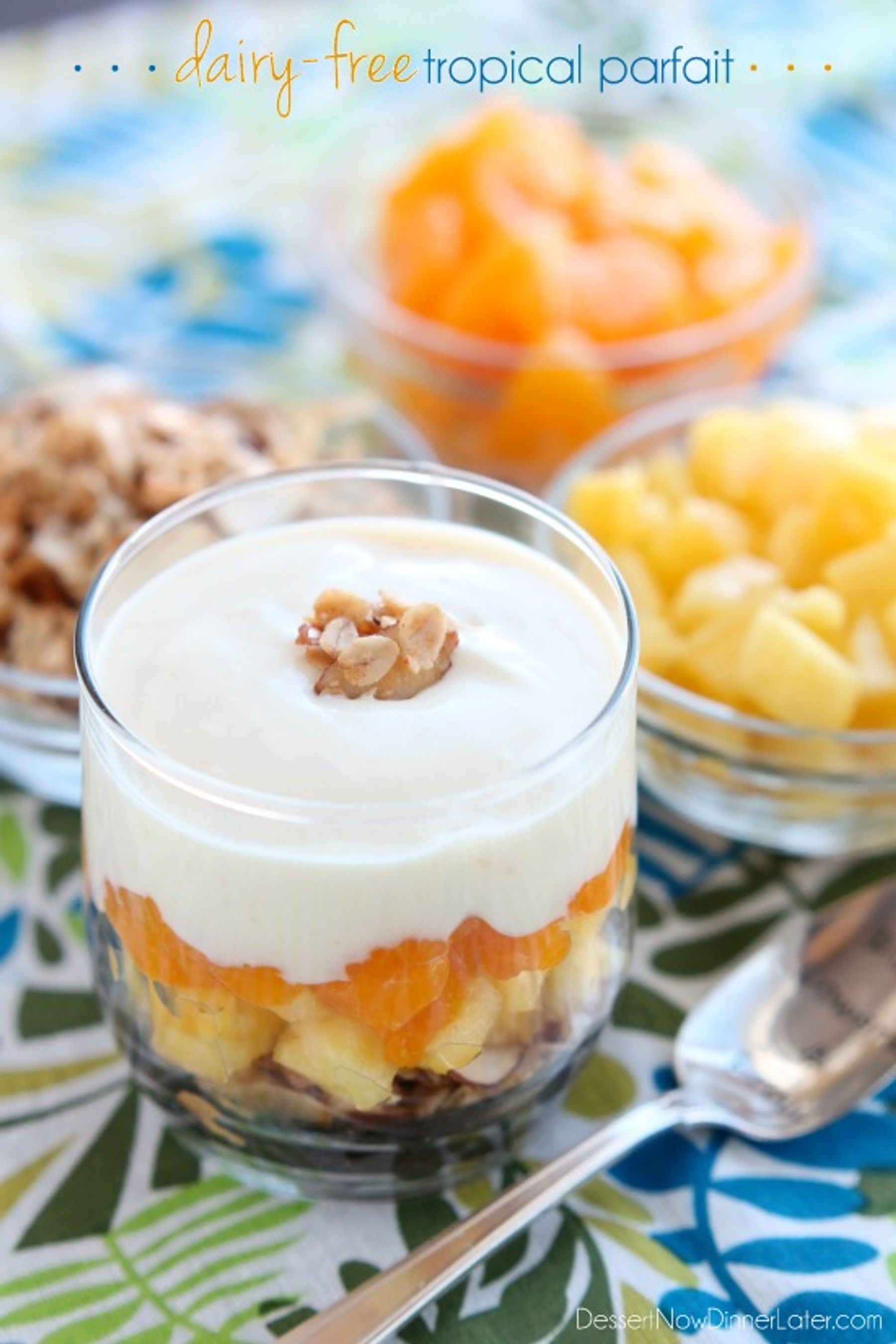Enjoy this Dairy-Free Tropical Parfait with a homemade honey almond coconut granola base, layers of pineapple and mandarin oranges, all topped with a creamy-textured, smooth Dairy-Free Yogurt Alternative from Silk!