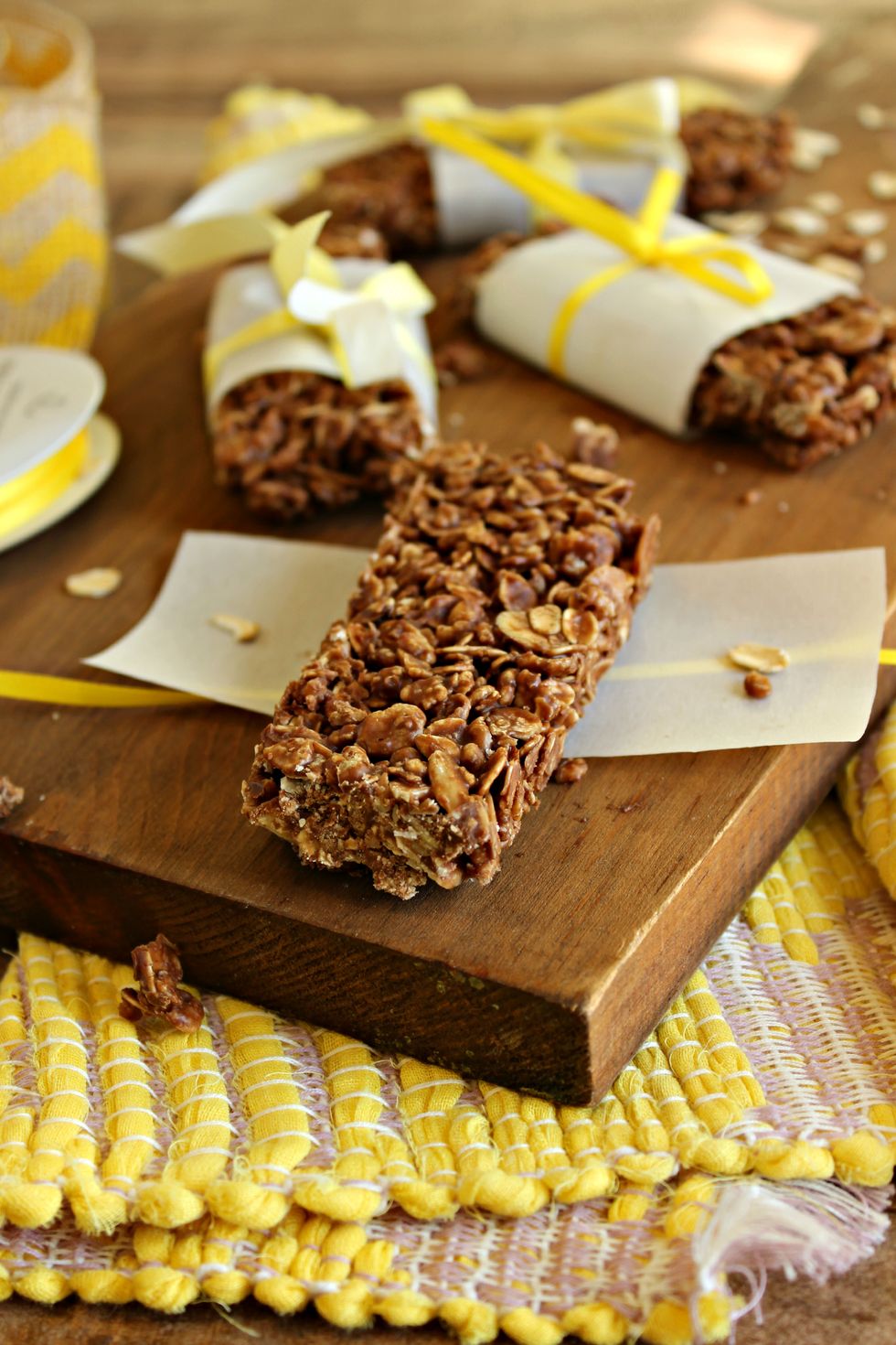A decadent fudgy dark chocolate with peanut butter granola bar. These bars are no-bake, easy, and healthy