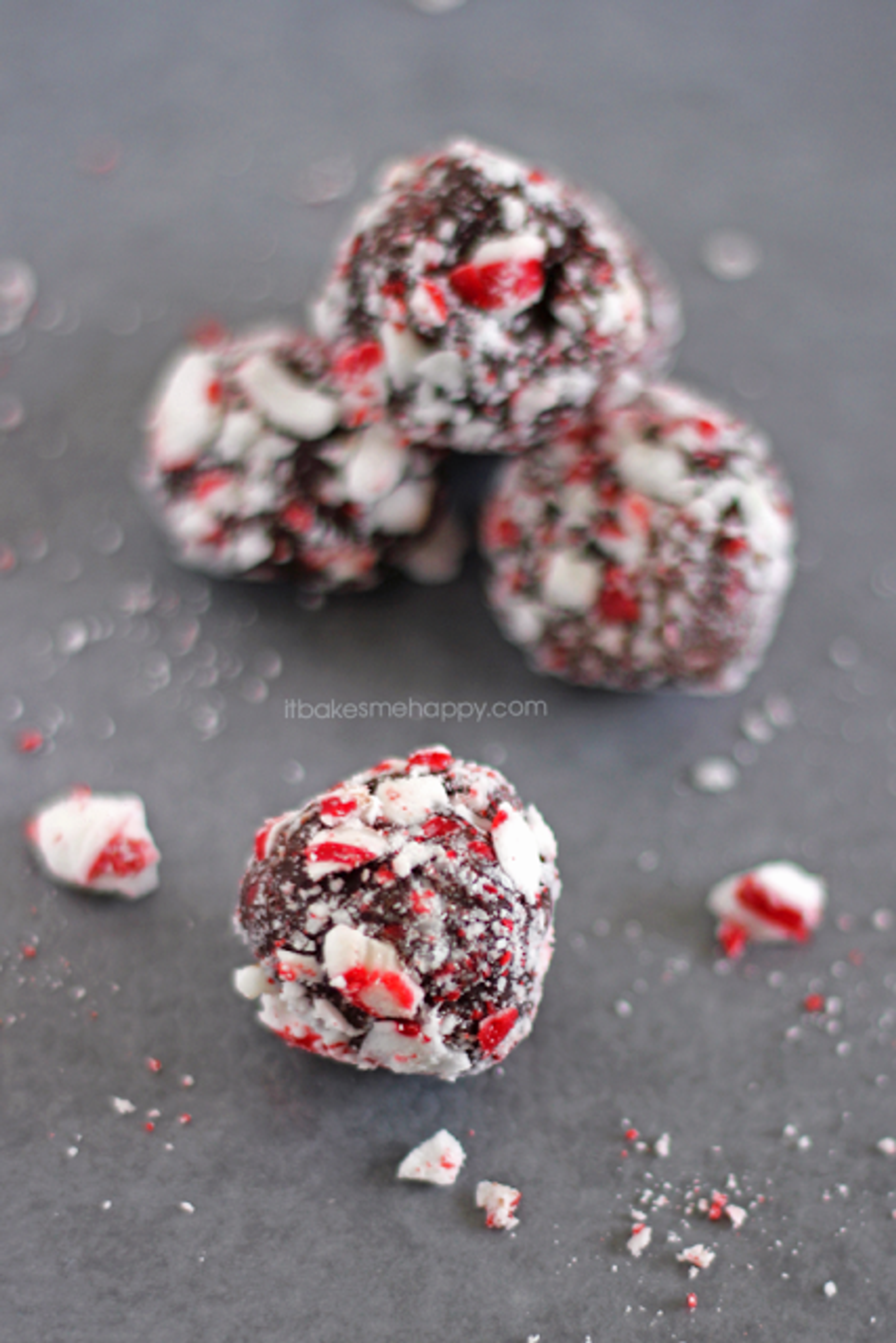 rich, dark chocolate truffles coated with crushed soft peppermints