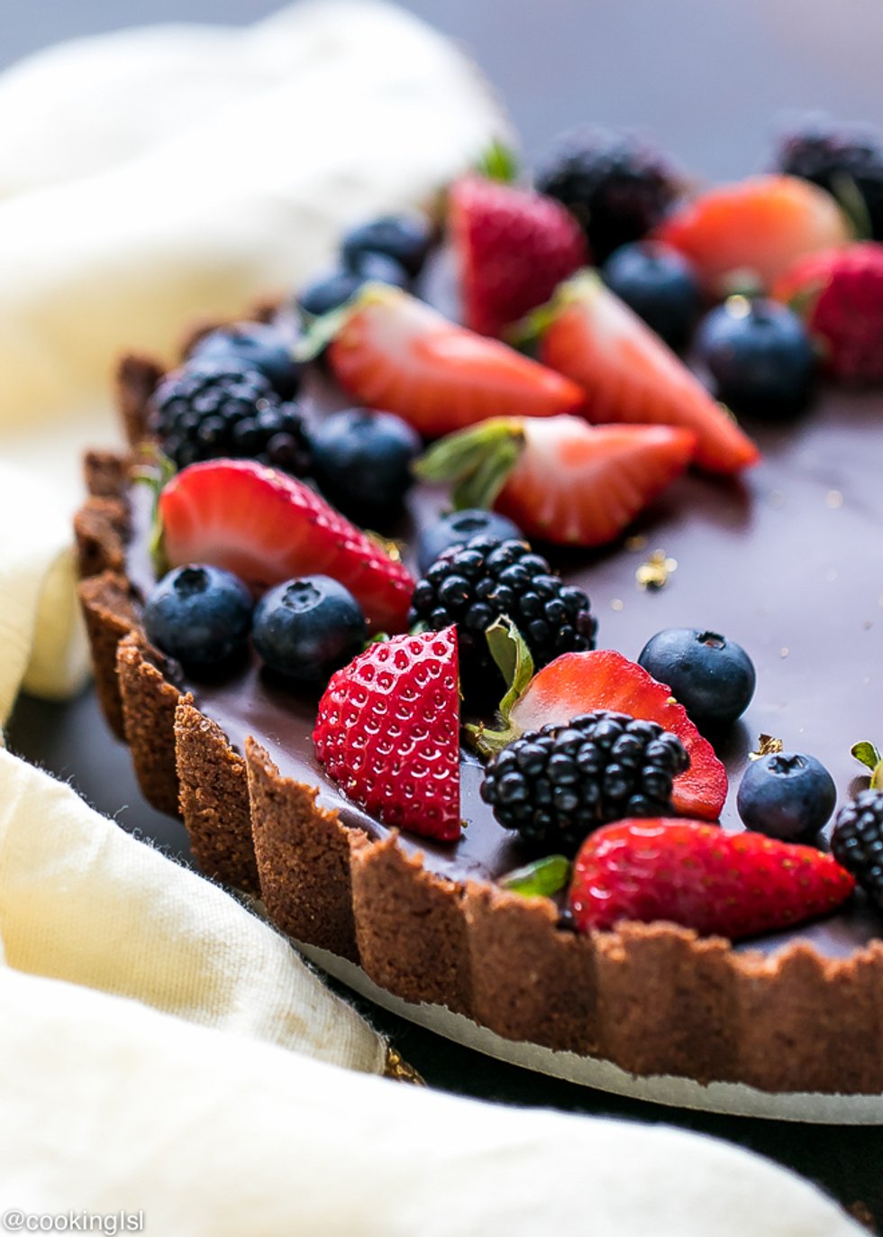 Dark Chocolate Tart Recipe – decadent and beautiful dessert, perfect for chocolate lovers. Chocolate graham cracker crust, chocolate filling and chocolate ganache – three layers of dark chocolate goodness. Topped with fresh berries.