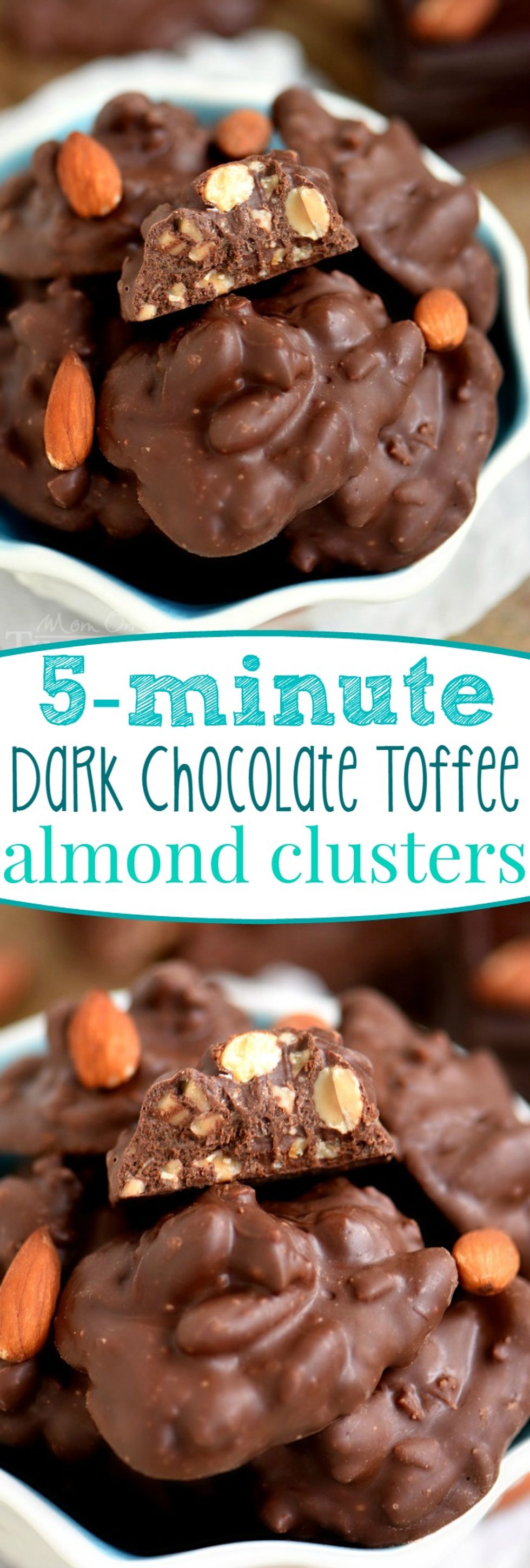 Just 5 minutes and 5 ingredients is all you’ll need for these easy and delicious Dark Chocolate Toffee Almond Clusters! Heart healthy almonds and sweet toffee bits are coated with antioxidant rich dark
