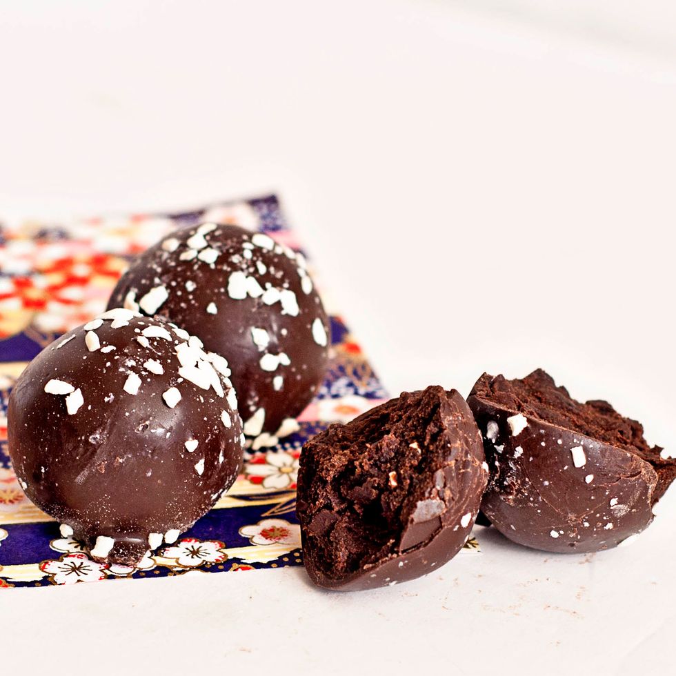 Using a 1-inch scoop or melon baller, scoop out chocolate mixture and transfer to a parchment-lined baking sheet. Coat hands in cocoa and roll chocolate into balls. Refrigerate on parchment-lined baking sheet 10 minutes.