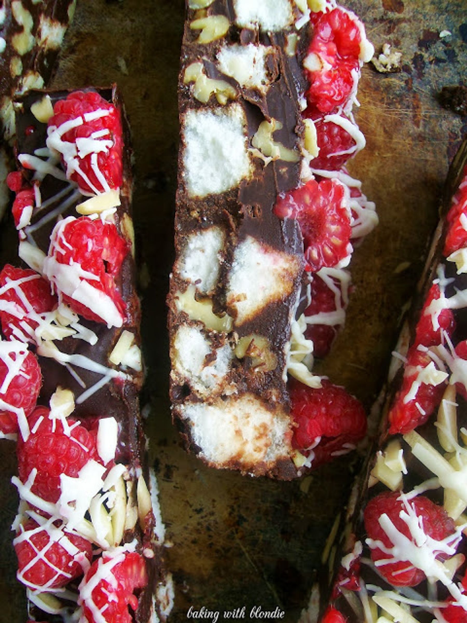 Dark Chocolate Fudge-like bars, studded with crunchy walnuts, fluffy pockets of angel food cake, and topped with fresh raspberries, toasted walnuts, and a white chocolate drizzle.