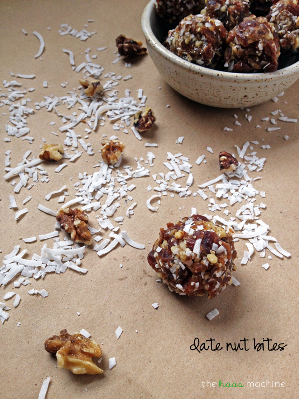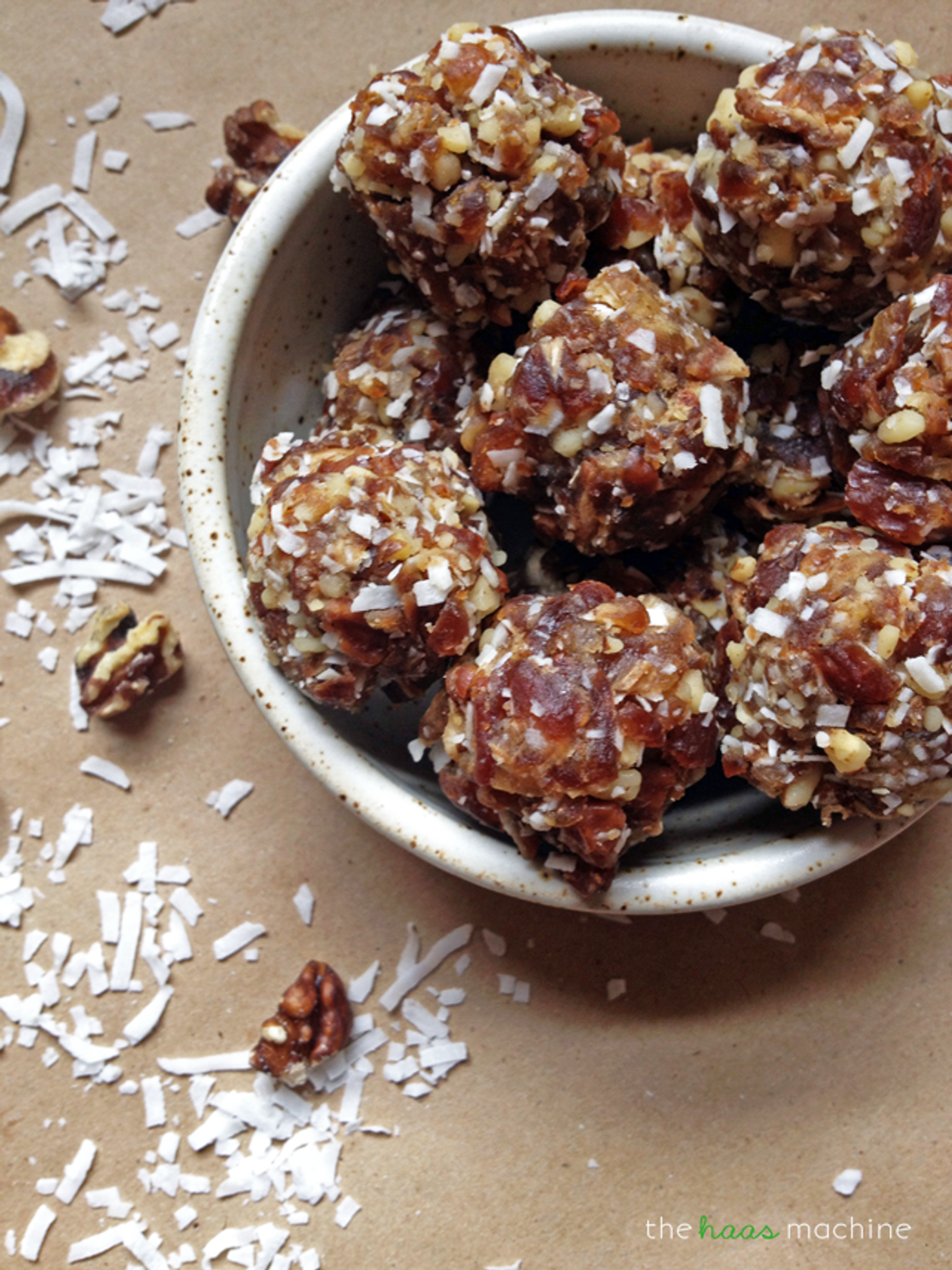 Pulse the walnuts on a food processor until they are very fine. Add the dates & pulse until smooth. Add the coconut flakes until everything is well-incorporated.