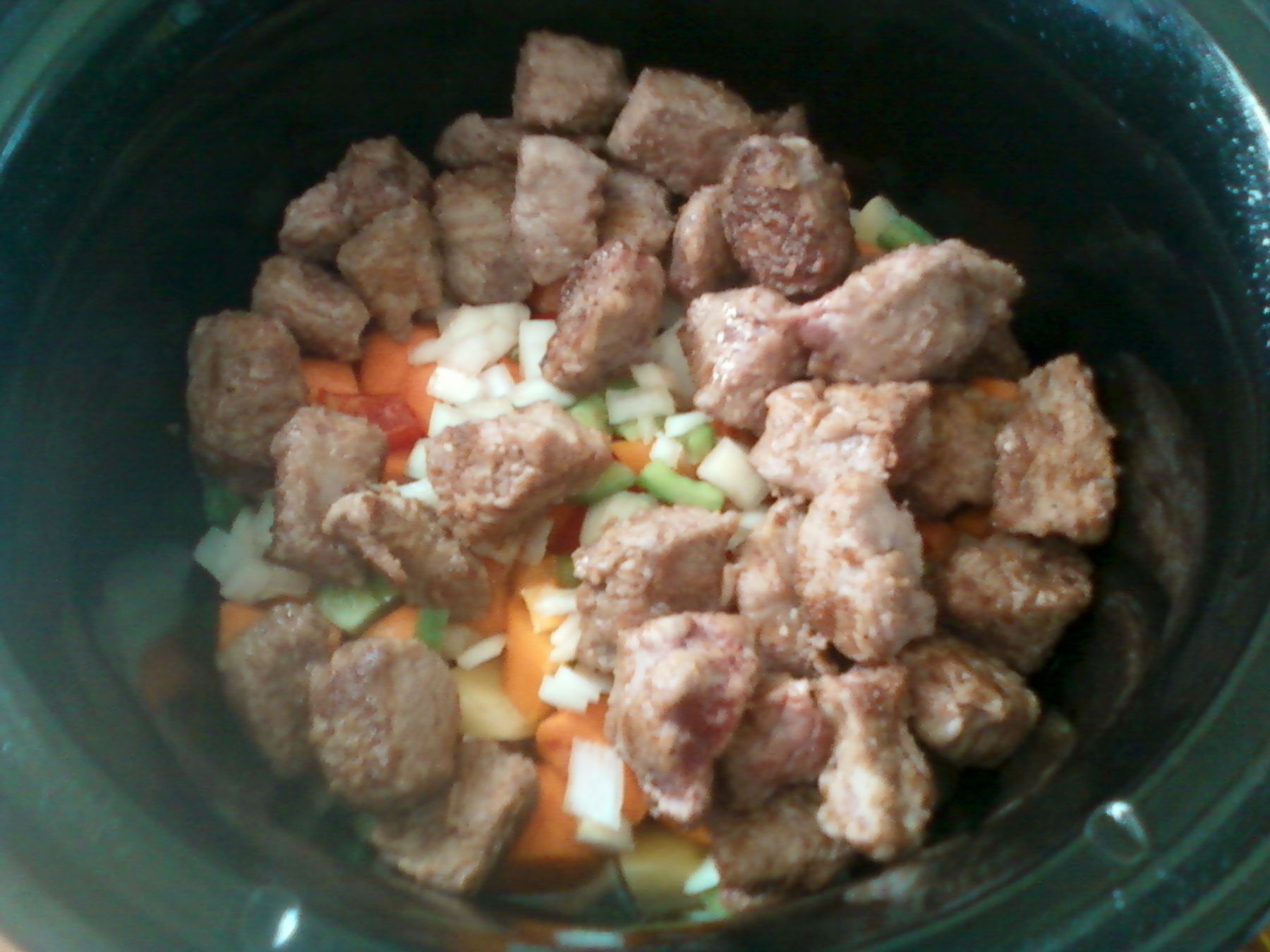 Dredge the meat in the flour and fry in a skillet with a tbsp of oil till lightly browned, remove and set aside. Peel, prepare and chop up all of your veggies. Add the veggies and beef to your crock pot along with the remaining ingredients. Cook on low 6-7 hours, high, 3-4. I added a dab of butter to the bowl - yummy!