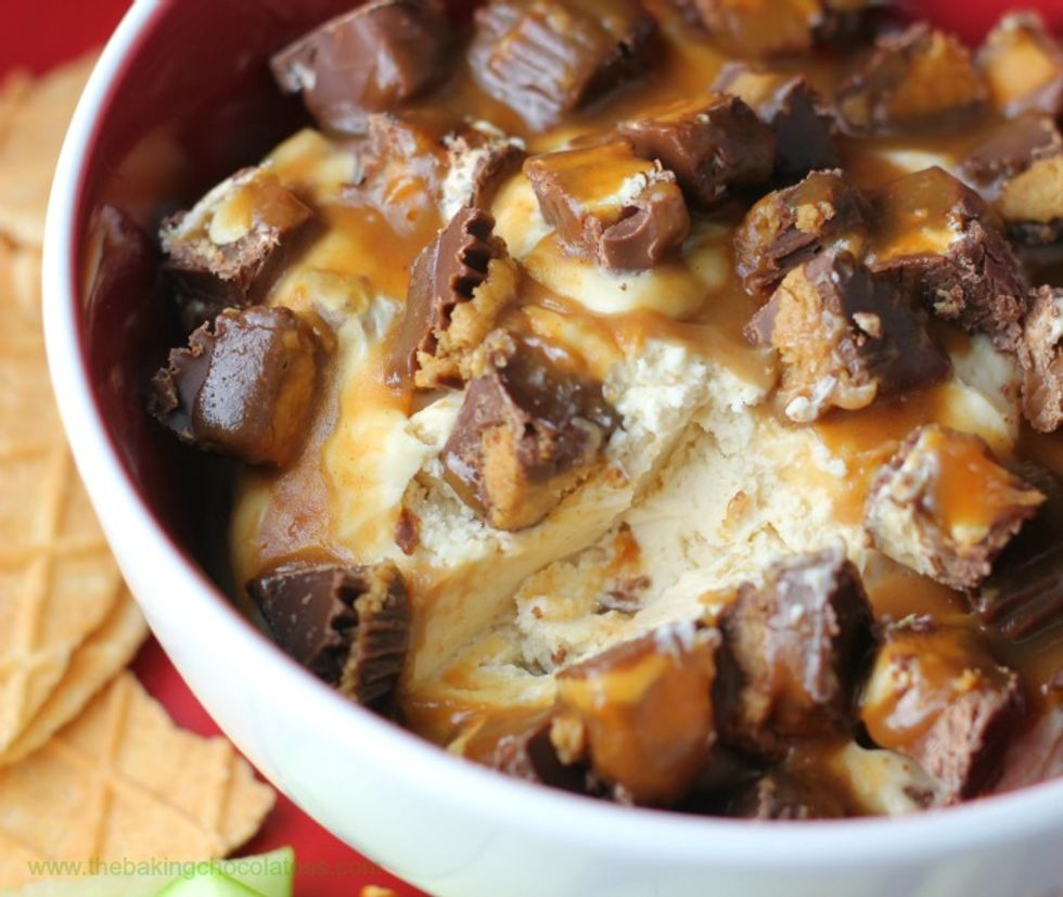 With such ingredients like Snickers Almond Candy Bars and Reese\\\'s Peanut Butter Cups stuffed in a wonderful creamy cheesecake fluffy dip, and then covered in caramel sauce...Tell me...Does it get any better?