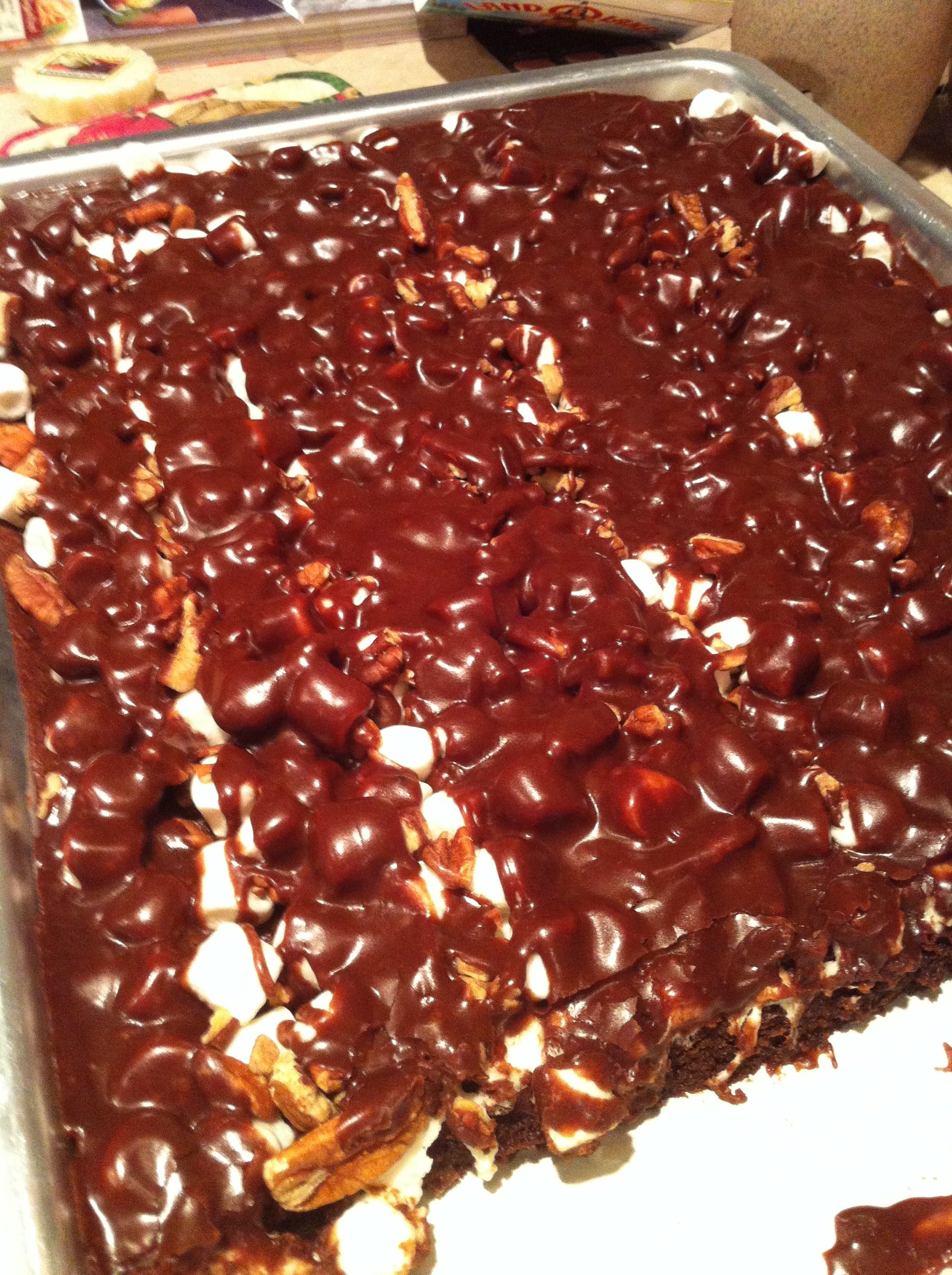 Sprinkle toasted pecans and pour chocolate frosting over top. Let cool.