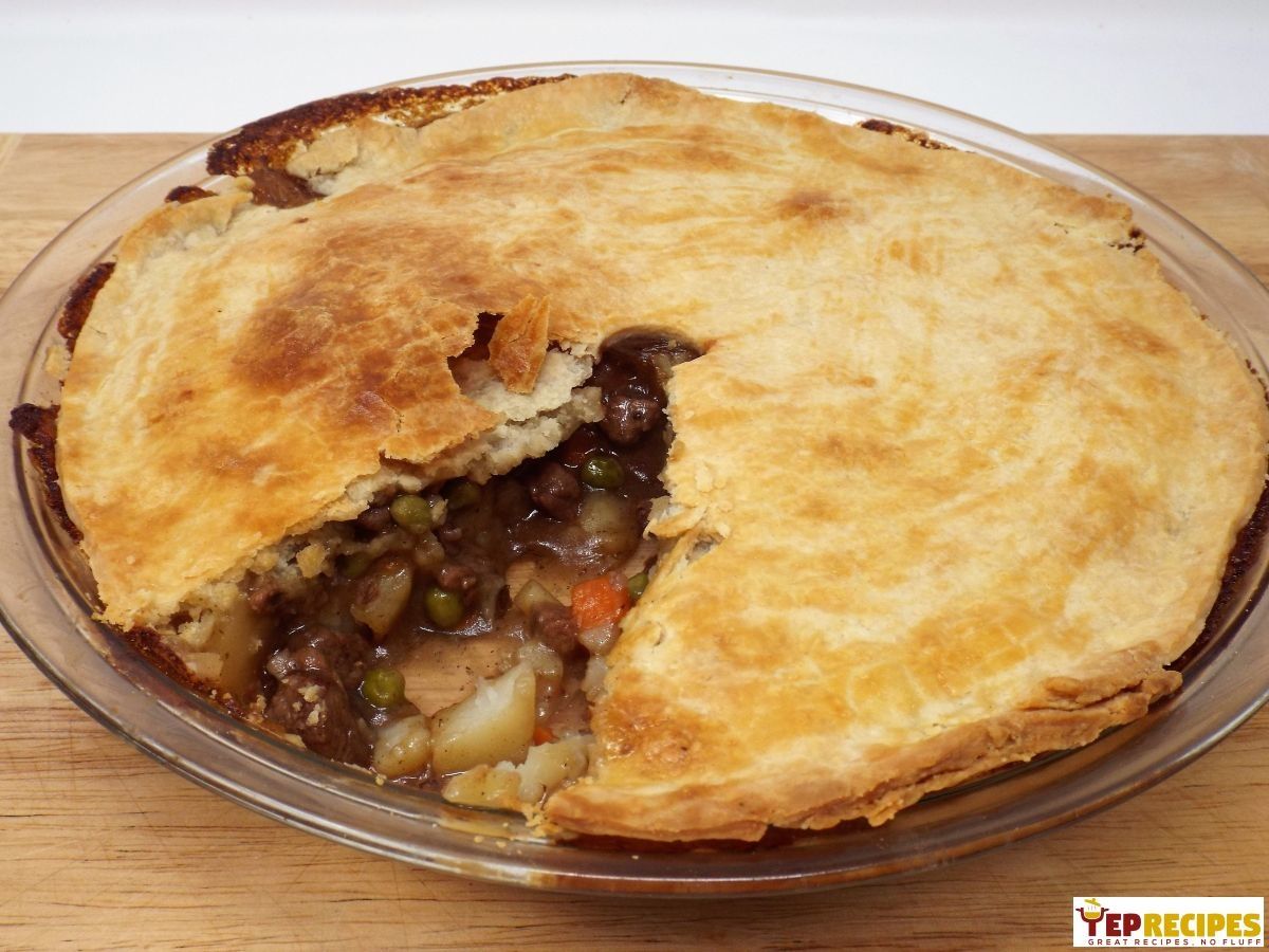 Tender stewed beef with potatoes, carrots, and peas topped with a flaky pie crust.